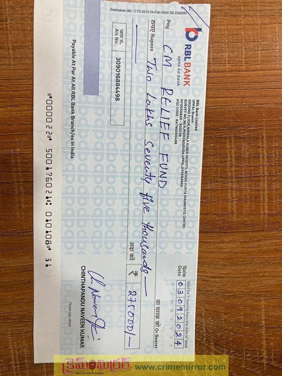వరద బాధితులకు సాయం చేయడానికి ముందుకు రావాలని ప్రభుత్వం కోరుతోంది. వరంగల్, ఖమ్మం, నల్గొండ పట్టభద్రుల ఎమ్మెల్యీ తీన్మార్ మల్లన్న ఇతర నాయకులకు ఆదర్శంగా నిలిచారు. వరద బాధితులకు సాయం ప్రకటించారు. ముఖ్యమంత్రి సహాయ నిధికి 2 లక్షల 75 వేల రూపాయల చెక్ పంపించారు తీన్మార్ మల్లన్న. వరద బాధితులకు అండగా నిలిచేందుకు అంతా ముందుకు రావాలని పిలుపిచ్చారు. వేల కోట్ల సంపాదించిన రాజకీయ నేతలు, వ్యాపారులు ఇంతవరకు వరద సాయం ప్రకటించలేదు. కాని కేవలం రెండు నెలల క్రితమే ఎమ్మెల్సీగా గెలిచిన తీన్మార్ మల్లన్న అందరి కంటే ముందే వరద సాయం ప్రకటించడంతో ఆయనపై ప్రశంసలు జల్లు కురుస్తోంది. అంతేకాదు తన మల్లన్న టీం సభ్యులను వరద సహాయక చర్యల్లో పాల్గొనాలని పిలుపిచ్చారు తీన్మార్ మల్లన్న.