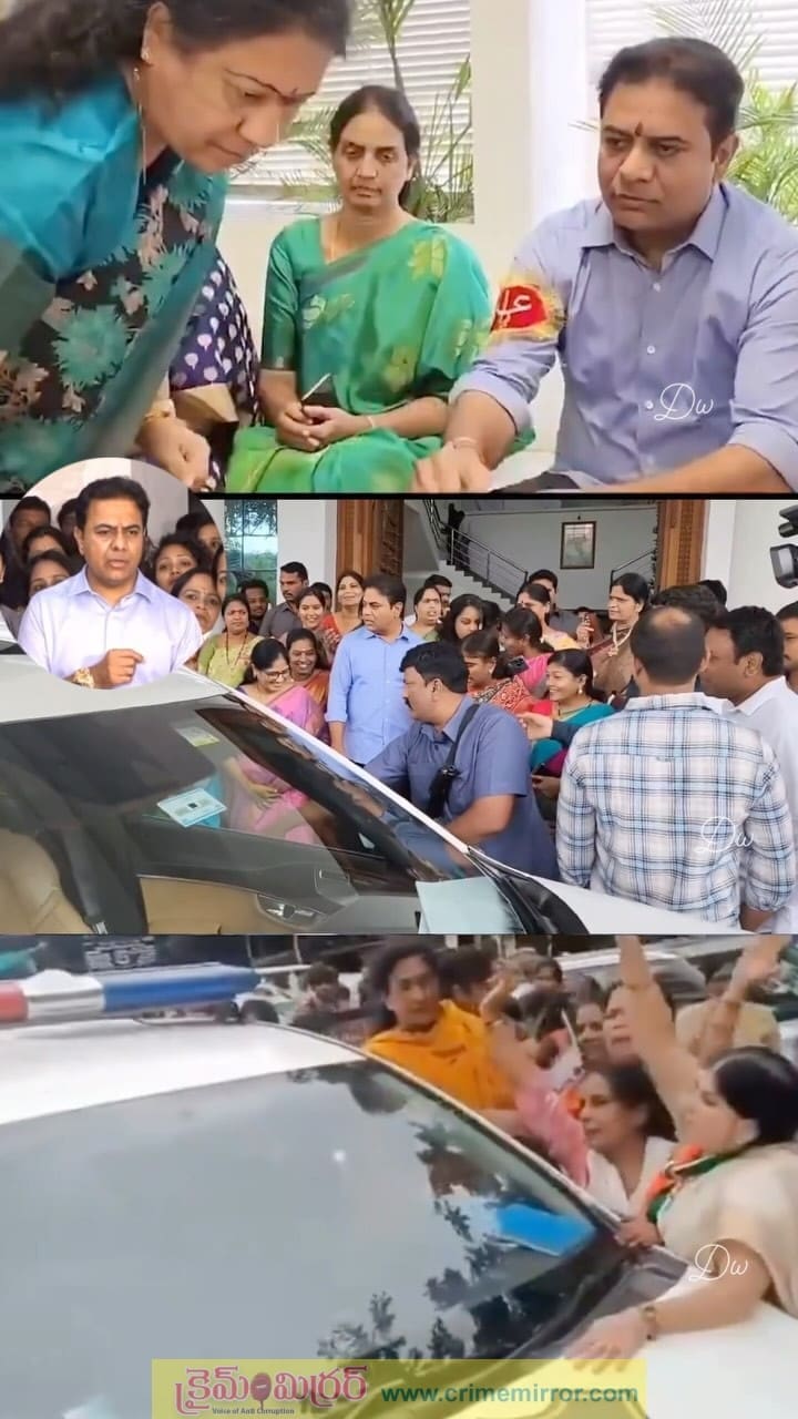 మహిళా కమిషన్ నోటీసులతో బీఆర్ఎస్ వర్కింగ్ ప్రెసిడెంట్ కేటీఆర్ విచారణకు హాజరైన సందర్భంగా నాటకీయ పరిణామాలు చోటు చేసుకున్నాయి. భారీ భద్రత మధ్య కేటీఆర్ను మహిళా కమిషన్ కార్యాలయం లోపలికి తీసుకెళ్లారు పోలీసులు. కేటీఆర్తో పాటు మాజీ మంత్రులు సబితా ఇంద్రారెడ్డి, సత్యవతి రాథోడ్ సహా వాకాటి సునీత, గండ్ర జ్యోతిని మహిళా కమిషన్ కార్యాలయంలోకి అనుమతించారు. కార్యాలయంలోకి వచ్చిన కేటీఆర్ను మహిళా కమిషన్ సభ్యులు ఆప్యాయంగా పలుకరించారు. కేటీఆర్కు రాఖీలు కట్టి తమ అభిమానాన్ని చాటుకున్నారు. ఈ వీడియో సోషల్ మీడియాలో వైరల్ అవుతోంది. ఇదేం ట్విస్టు అంటూ నెటిజన్లు కామెంట్లు పెడుతున్నారు.