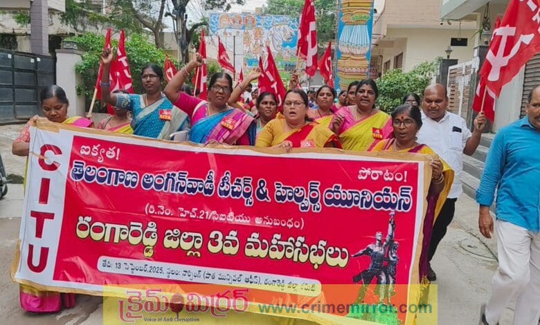 గండిపేట్, క్రైమ్ మిర్రర్:- రంగారెడ్డి జిల్లా తెలంగాణ అంగన్వాడీ టీచర్స్ అండ్ హెల్పర్స్ యూనియన్ మూడవ మహాసభలను శనివారం ఘనంగా నిర్వహించారు. ప్రీ ప్రైమరీ పీఎం శ్రీ విద్యాను అంగన్వాడీ కేంద్రాల్లోనే నిర్వహించాలని, పోషన్ ట్రాకర్ యాప్లో ఎప్ఆర్ఎస్ విధానిన్న రద్దు చేయాలని డిమాండ్ చేశారు. మంచిరేవుల ఎక్స్రోడ్ డాక్టర్ బీఆర్ అంబేద్కర్ విగ్రహానికి పూలమాలలు వేసి ర్యాలీని ప్రారంభించారు. అనంతరం ఈ మహాసభ ప్రాంగణంలో సిఐటీయూ జెండా సీనియర్ అంగన్వాడీ టీచర్స్ యూనియన్ నాయకురాలు సులోచన జెండా ఆవిష్కరించారు. అనంతరం ఈ సభ రాజ్యలక్ష్మి అధ్యక్షతన నిర్వహించారు. తెలంగాణ అంగన్వాడీ టీచర్స్ అండ్ హెల్పర్స్ యూనియన్ సీఐటీయూ రంగారెడ్డి జిల్లా ఆధ్వర్యంలో రంగారెడ్డి జిల్లా మూడో మహాసభలు నిర్వహించడం జరిగిందన్నారు. దీనికి ముఖ్యఅతిథిగా సీఐటీయూ రాష్ట్ర ఉపాధ్యక్షులు భూపాల్ హాజరై మాట్లాడుతూ కేంద్ర ప్రభుత్వ ఐసిడిఎస్ తో పాటు విద్యా వ్యవస్థను పూర్తిగా నిర్వీర్యం చేయడం కోసం నూతన జాతీయ విధాన విద్యా విధానo చట్టాన్ని తెచ్చిందన్నారు. ప్రమాదకరమైన విధానాలకు వ్యతిరేకంగా నిలబడాల్సిన రాష్ట్ర ప్రభుత్వం కూడా కేంద్ర ప్రభుత్వం సిఫార్సులను అమలు చేస్తుందని, ఐసిడిఎస్ ను నిర్వీర్యం పరచడానికి నిర్ణయం చేయడం అత్యంత దుర్మార్గకరమని, ప్రీ ప్రైమరీ పిఎం శ్రీ ఇంగ్లీష్ మీడియం విద్య పేరుతో ఆరు సంవత్సరాలలోపు పిల్లలకు విద్యాశాఖకు అప్పగించడం సరైంది కాదని, ఈ నిర్ణయాన్ని రాష్ట్ర ప్రభుత్వం తక్షణ వెనక్కి తీసుకొని ప్రీ ప్రైమరీ పీఎం శ్రీవిద్యను అంగన్వాడి కేంద్రాల్లోనే నిర్వహించాలని డిమాండ్ చేశారు.