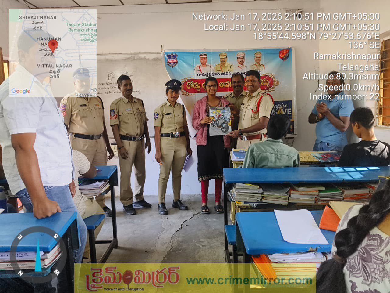 రామకృష్ణాపూర్,క్రైమ్ మిర్రర్:-తెలంగాణ రాష్ట్ర రోడ్డు భద్రతా సెల్ (పోలీస్, ట్రాన్స్పోర్ట్, హెల్త్ విభాగాలు) ఆధ్వర్యంలో నిర్వహిస్తున్న “ఆరైవ్ ఆలైన్–2026” రోడ్డు భద్రతా అవగాహన కార్యక్రమంలో భాగంగా తవక్కల్ హై స్కూల్ విద్యార్థులకు పోలీసులు రోడ్డు భద్రతపై అవగాహన కల్పించారు. ఈ సందర్భంగా ట్రాఫిక్ నియమాల పాటింపు, హెల్మెట్–సీట్బెల్ట్ వినియోగం, వేగ నియంత్రణ, మద్యం సేవించి వాహనం నడపకూడదనే అంశాలపై విద్యార్థులకు వివరించారు. అవగాహన కార్యక్రమంతో పాటు విద్యార్థుల్లో రోడ్డు భద్రతపై అవగాహన స్థాయిని పెంపొందించే ఉద్దేశంతో వ్యాసరచన, చిత్రలేఖనం పోటీలను కూడా నిర్వహించారు. రోడ్డు ప్రమాదాల నివారణే ఈ కార్యక్రమం లక్ష్యమని పట్టణ ఎస్సై భూమేష్ తెలిపారు.