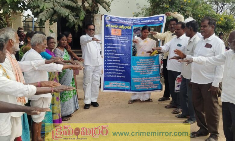 క్రైమ్ మిర్రర్,ఆత్మకూరు:- యాదాద్రి భువనగిరి జిల్లా,ఆత్మకూరు(ఎం)మండల కేంద్రంలో జిల్లా న్యాయ సేవ అధికార సంస్థ ఆదేశానుసారం తెలంగాణ గ్రామీణ వికాస బ్యాంక్ నందు మరియు ఎమ్మార్వో ఆఫీసు నందు తహసీల్దార్ లావణ్య మాట్లాడుతూ బాల్యవివాహాలపై మరియు రోడ్డు భద్రత గురించి అవగాహన కల్పించి ప్రతిజ్ఞ చేయించారు.