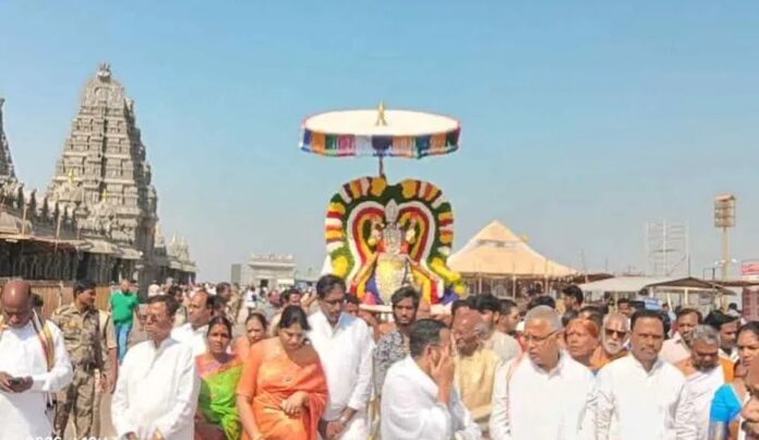 ఈ కార్యక్రమంలో ఆలయ ఈవో భవాని శంకర్, అనువంశిక ధర్మకర్త బీ. నరసింహ మూర్తి, డీఈవో భాస్కర్ శర్మ, ప్రధాన అర్చకులు కాండూరి వెంకటాచార్యులు, భట్టర్ సురేంద్రాచార్యులు తదితరులు పాల్గొన్నారు