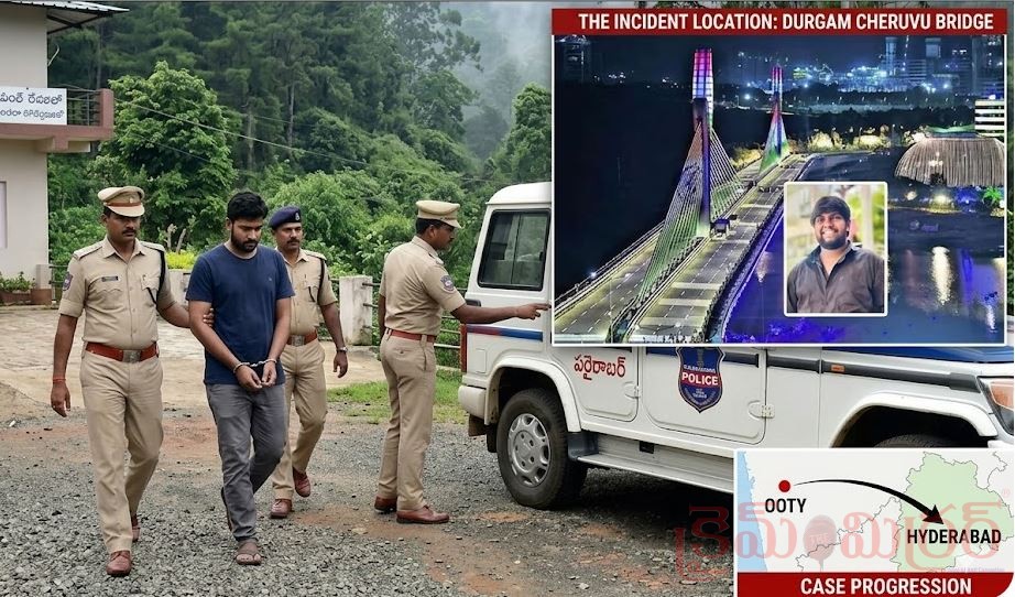 మాదాపూర్ క్రైమ్ మిర్రర్: ఏప్రిల్ 19, 2026 తెల్లవారుజామున హైదరాబాద్లోని దుర్గం చెరువు కేబుల్ బ్రిడ్జిపై జరిగిన ఘోర కారు ప్రమాదం నిందితుడిని పోలీసులు ఊటీ (Ooty) లో అరెస్ట్ చేశారు. హైదరాబాద్లోని దుర్గం చెరువు కేబుల్ బ్రిడ్జిపై మితిమీరిన వేగంతో వచ్చిన ఒక మెర్సిడెస్ బెంజ్ (Mercedes-Benz) కారు, ఫోటోలు తీసుకుంటున్న దంపతులను ఢీకొట్టింది.