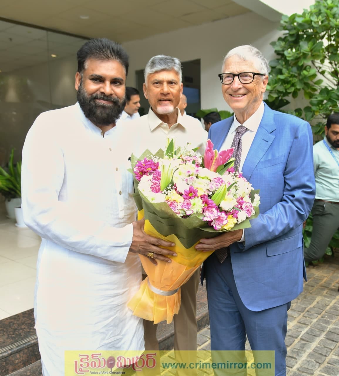 అమరావతి, క్రైమ్ మిర్రర్: ఏపీలో పర్యటించేందుకు వచ్చిన గేట్స్ ఫౌండేషన్ ఛైర్మన్ బిల్ గేట్స్ సోమవారం అమరావతిలోని రాష్ట్ర సచివాలయానికి చేరుకున్నారు. సచివాలయం మొదటి బ్లాకు వద్ద బిల్ గేట్స్కు ముఖ్యమంత్రి చంద్రబాబు నాయుడు, డిప్యూటీ సీఎం పవన్ కళ్యాణ్ స్వాగతం పలికారు.