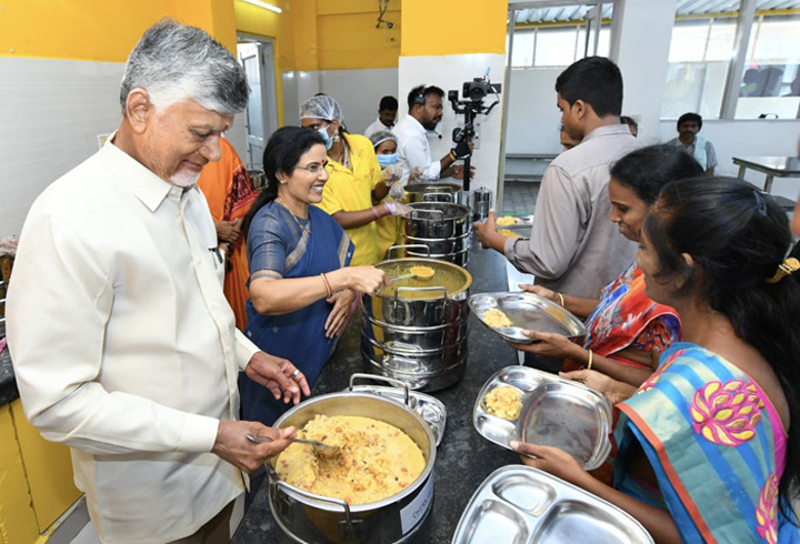 తరువాత రూ.10లు ఇచ్చి రెండు టోకెన్లు సీఎం చంద్రబాబు తీసుకోబోయారు. నేడు అన్నక్యాంటీన్లలో ఉచితంగా ఆహారం అని టోకెన్ నిర్వహకుడు చెప్పాడు. అనంతరం లబ్ధిదారులతో కలిసి అల్ఫాహారాన్ని సీఎం చంద్రబాబు దంపతులు తీసుకున్నారు. సోమవారం మంత్రి చంద్రబాబు జన్మదినాన్ని పురస్కరించుకుని రాష్ట్ర వ్యాప్తంగా ఉన్న అన్నక్యాంటీన్ల ఒక రోజు ఖర్చు రూ.76 లక్షల విరాళం నారా భువనేశ్వరి అందించారు. రాష్ట్ర వ్యాప్తంగా ఉన్న 269 అన్న క్యాంటీన్లలో సోమవారం ఉచితంగా అన్నదానం చేశారు.