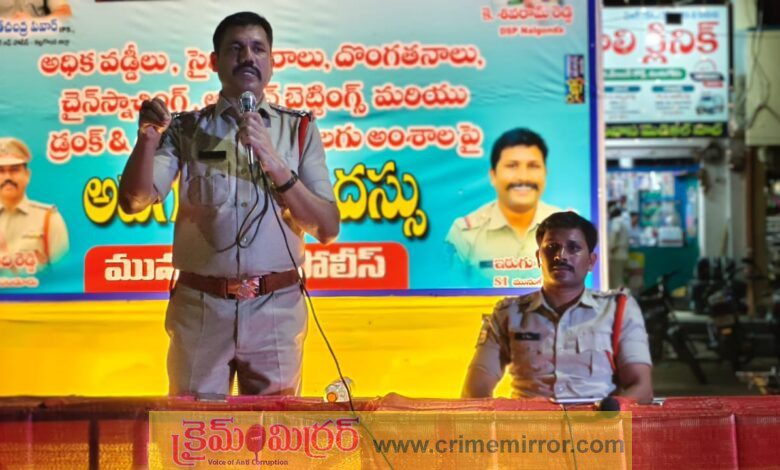 మునుగోడు, క్రైమ్ మిర్రర్ :- వాహనాలు నడిపే ప్రతి ఒక్కరు మందు తాగి వాహనాలు నడుపరాదు అని చండూరు సి ఐ ఆదిరెడ్డి అన్నారు. మునుగోడు పొలీస్ శాఖ మరియు ఆధ్వర్యములో అంబేద్కర్ చౌరస్తాలో అధిక వడ్డీలు,సైబర్ నేరాలు,దొంగతనాలు, చైన్ స్నాచింగ్,ఆన్లైన్ బెట్టింగ్,మరియు డ్రంక్ అండ్ డ్రైవ్, హెల్మెట్ మొదలగు అంశాలపై ఎస్సై ఇరుగు రవి కుమార్ అధ్యక్షతన ఏర్పాటు చేసిన అవగాహన సదస్సులో ముఖ్య అతిథిగా చండూరు సిఐ ఆదిరెడ్డి పాల్గొని ప్రజలకు పలు అంశాలపై అవగాహన కల్పించారు. సైబర్ నేరాల పట్ల ప్రజలు అప్రమత్తంగా ఉండాలని సోషల్ మీడియాలు చూసి అనవసరమైన యాప్లు ఓపెన్ చేసి యువత సైబర్ నెరగాలవలలు పడుతున్నారన్నారు తక్కువ వడ్డీకి ఎక్కువ లోన్లు ఇప్పిస్తాం ఇప్పిస్తామని ఆశ చూపించి అని ఆశ చూపించి మోసాలకు పాటుపడున్నారని అలాంటి నేరగాళ్ల పట్ల అప్రమత్తంగా ఉండాలని సూచించారు. అందుబాటులో వున్న పోలీస్ స్టేషన్ కు సమాచారం అందించాలి.