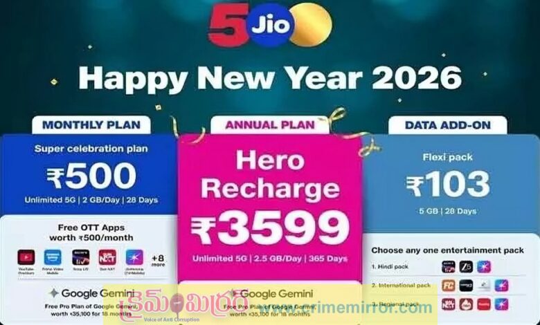 FLASH: న్యూ ఇయర్ను మరింత ప్రత్యేకంగా మార్చేందుకు రిలయన్స్ జియో తన వినియోగదారుల కోసం కొత్తగా ఆకర్షణీయమైన రీఛార్జ్ ప్లాన్లను ప్రకటించింది. టెక్నాలజీ, డేటా వినియోగం వేగంగా పెరుగుతున్న నేపథ్యంలో కస్టమర్ల అవసరాలను దృష్టిలో పెట్టుకుని ఈ ఆఫర్లను రూపొందించినట్లు జియో వెల్లడించింది. ముఖ్యంగా ఏడాది కాలంపాటు ఎక్కువ డేటా వినియోగించే వారికి ఈ ప్లాన్లు ఎంతో ఉపయోగకరంగా ఉండనున్నాయి. ఈ కొత్త ఆఫర్లలో అత్యంత కీలకంగా నిలుస్తున్నది రూ.3,599 రీఛార్జ్ ప్లాన్. ఈ ప్లాన్తో రీఛార్జ్ చేసుకున్న వినియోగదారులకు మొత్తం 365 రోజుల పాటు రోజుకు 2.5GB హైస్పీడ్ డేటా అందనుంది. దీంతో పాటు దేశవ్యాప్తంగా అపరిమిత వాయిస్ కాల్స్, రోజుకు 100 ఎస్ఎంఎస్లు కూడా లభిస్తాయి. దీర్ఘకాలిక రీఛార్జ్ కావడంతో తరచూ ప్లాన్ మార్పుల అవసరం లేకుండా ఏడాది పాటు నిర్భందం లేని కనెక్టివిటీని ఈ ప్లాన్ అందించనుంది.