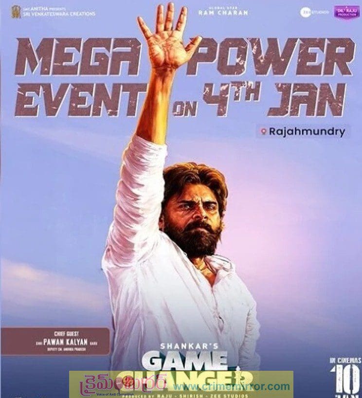 క్రైమ్ మిర్రర్, ఆన్లైన్ డెస్క్ :- గ్లోబల్ స్టార్ రామ్ చరణ్ నటించినటువంటి గేమ్ చేంజర్ సినిమా ఫ్రీ రిలీజ్ ఈవెంట్ కు పవన్ కళ్యాణ్ వస్తున్నారని మూవీ యూనిట్ తెలిపింది. శంకర్ డైరెక్షన్లో హీరో రామ్ చరణ్ నటిస్తున్నటువంటి సినిమా కావడంతో ఈ సినిమాపై భారీ అంచనాలే నెలకొన్నాయి. ఈనెల 4వ తారీఖున అనగా రేపు సాయంత్రం రాజమండ్రిలో ఈ సినిమా ఫ్రీ రిలీజ్ ఈవెంట్ జరుగుతుందని చిత్ర బృందం ప్రకటించింది. కాగా ఈ ఫ్రీ రిలీజ్ ఈవెంట్ కు ఆంధ్ర ప్రదేశ్ డిప్యూటీ సీఎం పవన్ కళ్యాణ్ వస్తున్నట్లుగా అనధికారికంగా ప్రకటిస్తూ ఒక పోస్టర్ను విడుదల చేశారు.