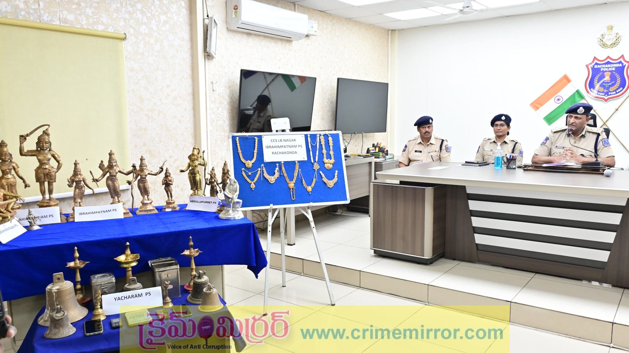క్రైమ్ మిర్రర్, హైదరాబాద్ :-రాచకొండ పోలీస్ కమిషనరేట్ పరిధిలోని యాచారం, ఇబ్రహీంపట్నం, అబ్దుల్లాపూర్ మెట్ పోలీస్ స్టేషన్ల పరిధిలో దేవాలయాలపై దాడులు జరిపి విగ్రహాలు, ఇతర విలువైన వస్తువులు చోరీ చేసిన ముఠాను పోలీసులు అరెస్ట్ చేశారు.ఏపీకి చెందిన శివానంద్, షరీఫ్ అనే ఇద్దరు వ్యక్తులు దేవాలయాల్లో పంచలోహ విగ్రహాలు, నగలపై కన్నేసి దొంగతనాలకు పాల్పడుతూ పట్టుబడ్డారని రాచకొండ పోలీస్ కమిషనర్ సుదీర్ బాబు ఎల్బీనగర్ క్యాంప్ కార్యాలయంలో వెల్లడించారు. ఉప్పల్ లో ఒక బైక్ ను కూడా దొంగిలించి, అదే వాహనంపై తిరుగుతూ మద్యం మత్తులో నేరాలు చేసేవారని తెలిపారు.