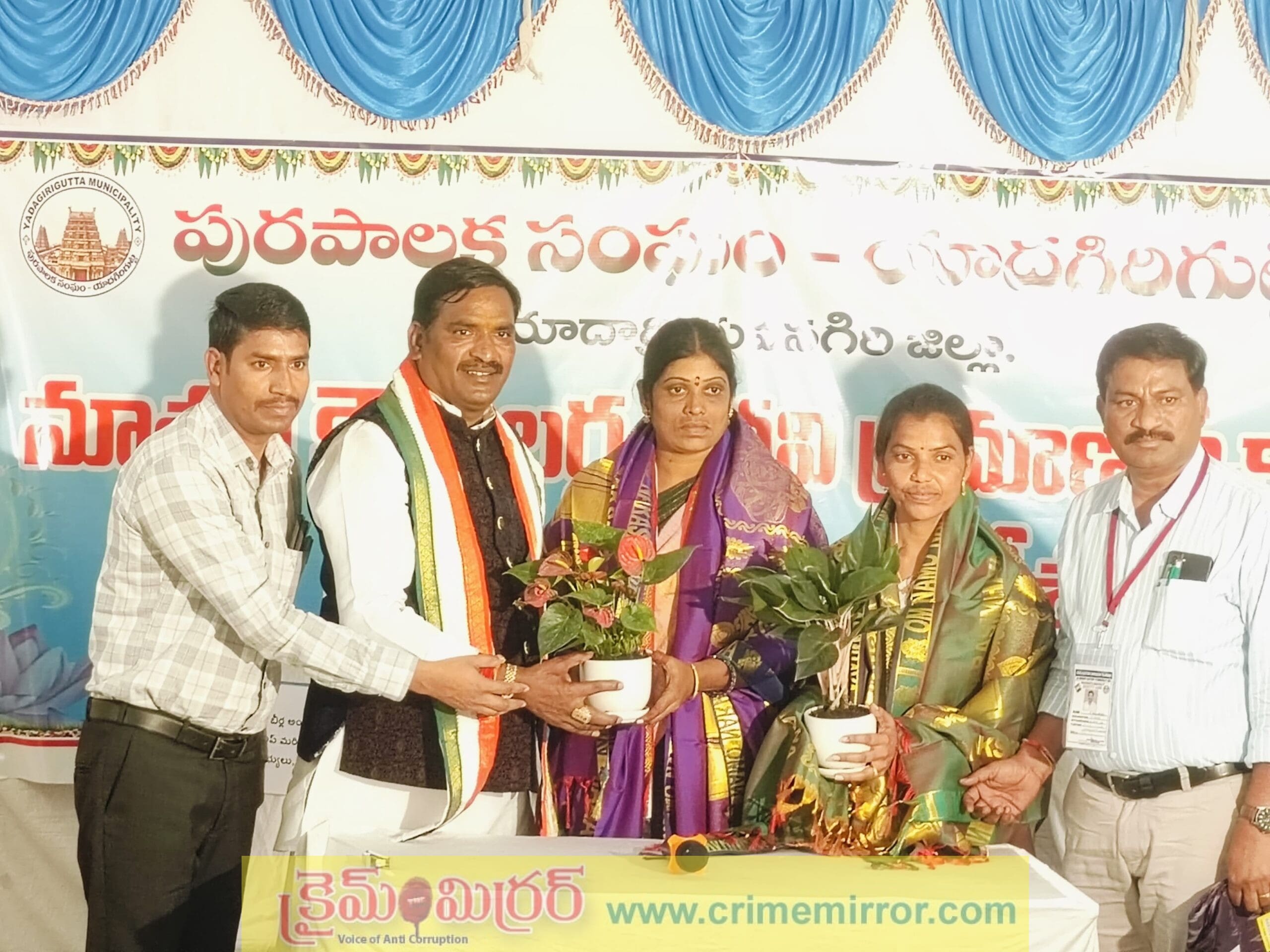 క్రైమ్ మిర్రర్, ఆత్మకూరు:- యాదాద్రి భువనగిరి జిల్లా, యాదగిరిగుట్ట మున్సిపాలిటీలో చైర్ పర్సన్గా గుండ్లపల్లి వాణి భరత్ గౌడ్ ఎన్నికయ్యారు. వైస్ చైర్ పర్సన్ గా బరిగే రమ్య రామచందర్ ఎన్నికయ్యారు.ఈ సందర్భంగా వారి యొక్క ఎన్నిక తర్వాత ప్రమాణ స్వీకారం చేశారు.అనంతరం వారు పదవి బాధ్యతలు చేపట్టారు.ఈ కార్యక్రమంలో ముఖ్య అతిథిగా ప్రభుత్వ విప్,ఆలేరు ఎమ్మెల్యే డిసిసి అధ్యక్షులు బీర్ల అయిలయ్య పాల్గొన్నారు. ఈ సందర్భంగా మున్సిపల్ కార్యాలయం నుండి వైకుంఠ ద్వారం వరకు ర్యాలీ నిర్వహించారు.రంగులు జల్లుకుని స్వీట్స్ పంచుకొని ముదిరాజ్ ఉత్సవాలలో మునిగిపోయారు.
