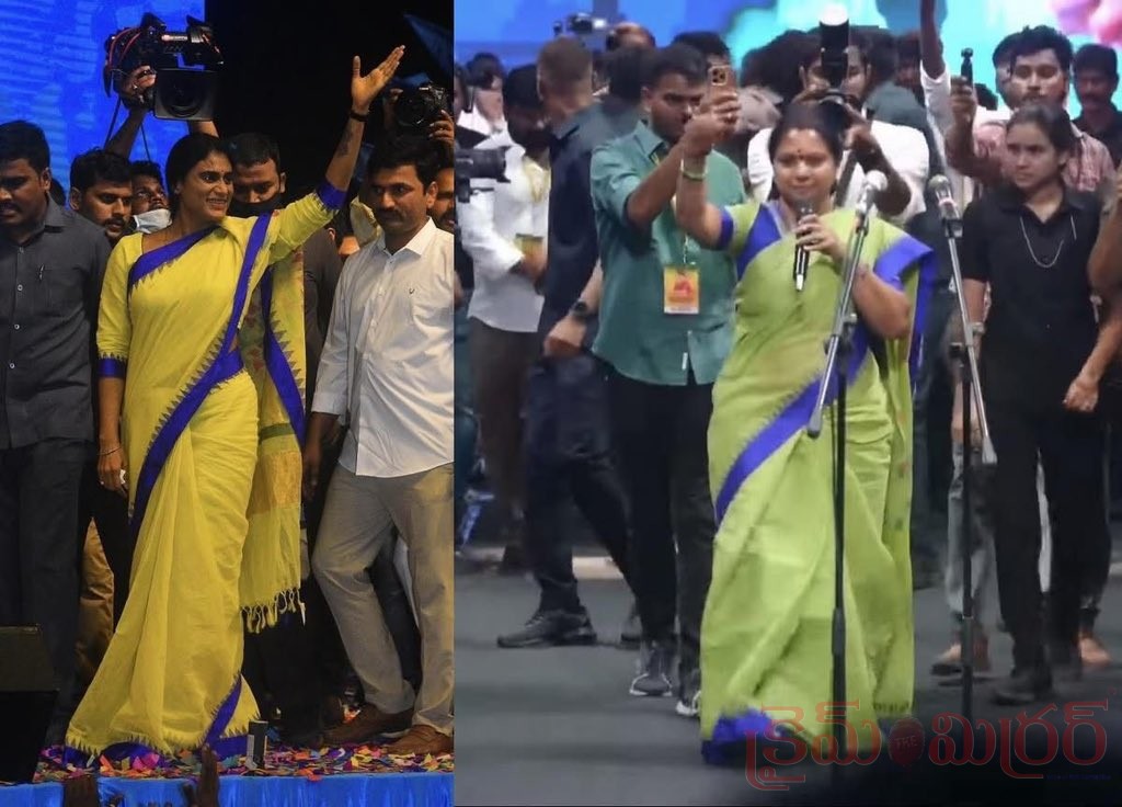 క్రైమ్ మిర్రర్, తెలంగాణ స్టేట్ బ్యూరో: రాజకీయ వేదికల్లో ఇప్పుడు ఆసక్తికరంగా మారిన చర్చల్లో ఒకటి — వైస్ షర్మిల మరియు కల్వకుంట్ల కవిత ధరించిన చీరల విషయం. ఇద్దరూ వేర్వేరు రాజకీయ నేపథ్యాలకు చెందిన నాయకులు అయినప్పటికీ, ఒకే తరహా పచ్చ-నీలం చీర కాంబినేషన్లో కనిపించడం ప్రజల్లో ఆసక్తిని రేకెత్తించింది. సాధారణంగా రాజకీయ నాయకుల దుస్తులు కూడా ఒక సందేశాన్ని ఇస్తాయని భావించే నేపథ్యంలో, ఈ పోలిక మరింత చర్చకు దారితీసింది.