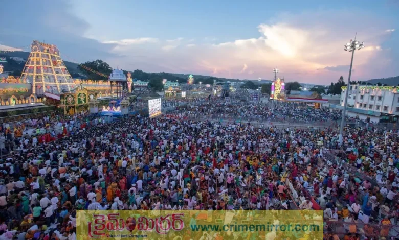 క్రైమ్ మిర్రర్, ఆంధ్రప్రదేశ్ :- గత కొద్ది రోజులుగా తిరుమల తిరుపతి దేవస్థానంలో భక్తుల సంఖ్య తగ్గిందని చాలానే వార్తలు వచ్చాయి. కానీ తిరుమల తిరుపతి క్షేత్రానికి భక్తులు రాకును ఎవరు ఆపగలరు?.. అన్నట్టుగా నేడు తిరుమల భక్తులతో కిక్కిరిసిపోయింది. ఎక్కడ చూసినా కూడా భక్తులు కనిపిస్తుండడంతో తిరుపతి క్షేత్రం ‘భక్త జనసంద్రం’ ల కనిపిస్తుంది. నేడు శ్రీవారి గరుడ వాహన సేవ జరుగుతున్న కారణంగా భక్తులు పెద్ద సంఖ్యలో తిరుమల తిరుపతి దేవస్థాన కొండపైకి చేరుకున్నారు. ప్రస్తుతం స్వామివారి దర్శనానికి 24 గంటల సమయం పడుతుంది. ఇక ఆక్టోపస్ భవనం నుంచి క్యూ కూడా కొనసాగుతూ ఉంది. ఇవాళ భక్తులు పెద్ద సంఖ్యలో ఎందుకు వచ్చారంటే రెండు కారణాలు ఉన్నాయి. అందులో ఒకటి నేడు గరుడ వాహన సేవ జరుగుతుంది. ఇక రెండవది శనివారం, ఆదివారం సందర్భంగా పెద్ద ఎత్తున భక్తులు వెంకటేశ్వర స్వామి ఉత్సవాలు చూడడానికి వస్తున్నారు.