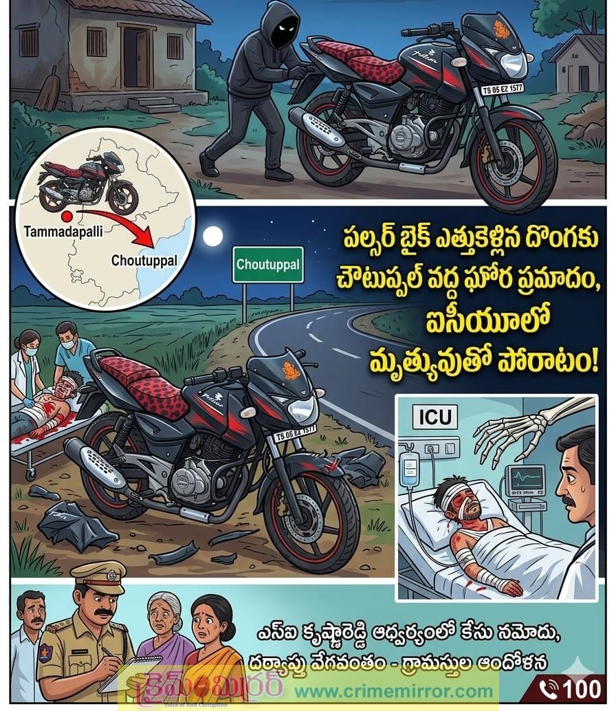వేగం మృత్యుపాశమై సదరు దొంగను కాటేసింది. చౌటుప్పల్ సమీపంలో బైక్ అదుపుతప్పి ప్రమాదానికి గురికావడంతో, నిందితుడికి తీవ్ర గాయాలయ్యాయి. ప్రస్తుతం అతను ఆసుపత్రిలో ఐసీయూ బెడ్పై కొట్టుమిట్టాడుతున్నాడు. చేసిన తప్పుకు శిక్ష వెంటనే అనుభవించడం అంటే ఇదేనేమో అని స్థానికులు చర్చించుకుంటున్నారు.వరుసగా జరుగుతున్న ఈ దొంగతనాలతో, మండల ప్రజలు బిక్కుబిక్కుమంటున్నారు. ఇళ్ల ముందు పార్క్ చేసిన వాహనాలు కూడా, మాయమవుతుండటంతో ప్రజలు భయందోలన చెందుతున్నారు.