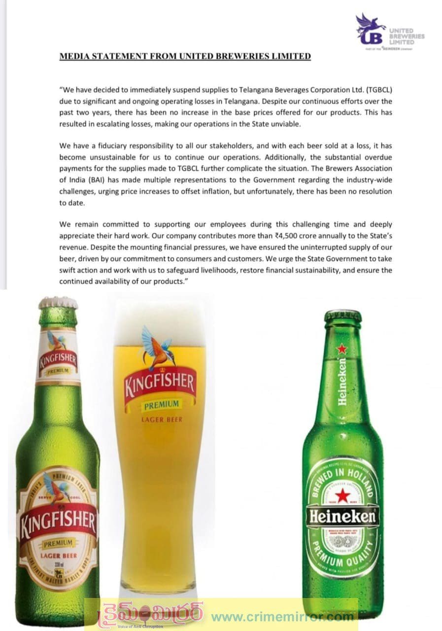 తెలంగాణలో మందుబాబులకు ఊహించని షాక్ తగిలింది. తెలంగాణలో ఇకపై కింగ్ పిషర్ బీర్లు కనిపించవు. రాష్ట్రంలో ఎక్కువగా అమ్ముడుపోయేవి కింగ్ పిషర్ బీర్లే. సేలయ్యే బీర్లలో 60 శాతం వాటా ఒక్క కింగ్ పిషర్ దే. అయితే తెలంగాణకు బీర్ల సరఫరా నిలిపివేస్తున్నట్లు కింగ్ పిషర్ బీర్ల తయారీ సంస్థ యునైటెడ్ బ్రూవరీస్ తెలిపింది.యూబీ ప్రకటనతో తెలంగాణకు కింగ్ పిషర్ బీర్ల సరఫరా ఆగిపోయింది.