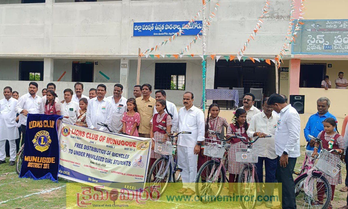 మునుగోడు, క్రైమ్ మిర్రర్ ప్రతినిధి : మునుగోడు మండలంలోని నిరుపేద విద్యార్థులకు విద్యా ప్రోత్సాహం కల్పించేందుకు లయన్స్ క్లబ్ మునుగోడు శ్రేయోభిలాషి అడుగులు వేసింది. స్వాతంత్ర దినోత్సవం సందర్భంగా శుక్రవారం జిల్లా పరిషత్ పాఠశాల మునుగోడు ప్రాంగణంలో ఉచిత సైకిళ్ల పంపిణీ కార్యక్రమాన్ని ఘనంగా నిర్వహించారు.