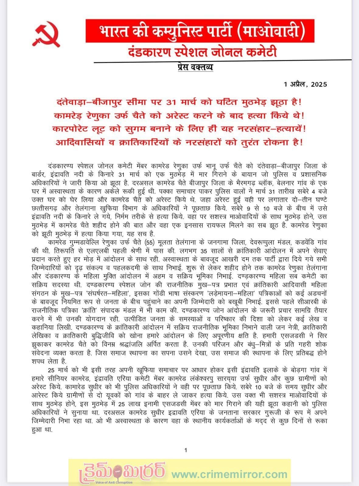 దంతెవాడ-బీజాపూర్ జిల్లా సరిహద్దు ఇంద్రావతి నది ఒడ్డున మార్చి 31న జరిగిన ఎన్కౌంటర్లో దండకారణ్య స్పెషల్ జోనల్ కమిటీ సభ్యురాలు కామ్రేడ్ రేణుక అలియాస్ భాను అలియాస్ చైతే చనిపోయారని పోలీసులు, పరిపాలనా అధికారులు విడుదల చేసిన ప్రకటన అవాస్తవం. వాస్తవానికి, కామ్రేడ్ చైతే అనారోగ్యం కారణంగా బీజాపూర్ జిల్లా భైరామ్ఘర్ బ్లాక్లోని బెల్నార్ గ్రామంలోని ఒక ఇంట్లో ఒంటరిగా ఉన్నాడు. ధృవీకరించబడిన వార్తలను అందుకున్న తరువాత, పోలీసులు మార్చి 31 తెల్లవారుజామున 4 గంటలకు పేర్కొన్న ఇంటిని చుట్టుముట్టారు మరియు కామ్రేడ్ చైట్ను అరెస్టు చేశారు. అరెస్టు జరిగిన ప్రదేశంలోనే ఛత్తీస్గఢ్, తెలంగాణ ఇంటెలిజెన్స్ డిపార్ట్మెంట్ అధికారులు రెండు-మూడు గంటల పాటు ఆయనను నిరంతరం విచారించారు. ఉదయం 9 నుంచి 10 గంటల మధ్య ఇంద్రావతి నది ఒడ్డుకు తీసుకెళ్లి దారుణంగా హత్య చేశారు. అక్కడ సాయుధ మావోయిస్టులతో జరిగిన ఎన్కౌంటర్, ఆ ఎన్కౌంటర్లో కామ్రేడ్ చైత్ వీరమరణం పొందడం మరియు అక్కడ ఒక INSAS రైఫిల్ దొరికినట్లు అన్నీ అబద్ధాలు. కామ్రేడ్ రేణుక తప్పుడు ఎన్కౌంటర్లో చనిపోయింది, ఇది నిజం.