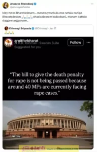 ఇదే సమయంలో తనపై సోషల్ మీడియాలో అసభ్యకర వ్యాఖ్యలు, వ్యక్తిగత దూషణలు జరుగుతున్నాయంటూ ఏకంగా 73 మంది వ్యక్తులపై ఫిర్యాదు చేయడం ద్వారా అనసూయ అందరినీ షాక్‌కు గురిచేసింది. మహిళలను లక్ష్యంగా చేసుకుని చేసే దూషణలకు చట్టపరమైన చర్యలు తప్పవని ఆమె బహిరంగంగా హెచ్చరించింది. ఈ పరిణామం సినీ ఇండస్ట్రీలోనే కాదు, సోషల్ మీడియాలో కూడా పెద్ద చర్చకు కారణమైంది. ఈ వివాదం ఇంకా చల్లారకముందే తాజాగా అనసూయ మరో ట్వీట్‌తో మళ్లీ హాట్ టాపిక్‌గా మారింది. సింగర్ చిన్మయి చేసిన ఓ ట్వీట్‌కు అనసూయ ఇచ్చిన రిప్లై ఇప్పుడు నెట్టింట వైరల్ అవుతోంది. ‘‘దాదాపు 40 మంది ఎంపీలు ప్రస్తుతం అత్యాచార కేసుల్లో నిందితులుగా ఉన్న కారణంగా, అత్యాచార నేరస్తులకు మరణశిక్ష విధించే బిల్లుకు ఆమోదం లభించడం లేదు’’ అంటూ చిన్మయి చేసిన వ్యాఖ్యలు తీవ్ర చర్చకు దారితీశాయి.