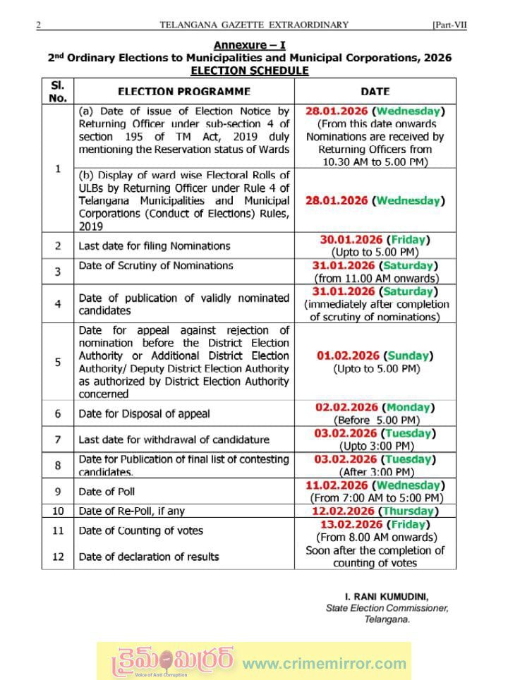 HomeతెలంగాణCrime Mirror Big Breaking: మున్సిపల్ ఎన్నికల షెడ్యూల్..!తెలంగాణరాజకీయంCrime Mirror Big Breaking: మున్సిపల్ ఎన్నికల షెడ్యూల్..!By Anji PeraboinaJanuary 27, 20260272ShareFacebookTwitterPinterestWhatsApp Crime Mirror Big Breaking: మున్సిపల్ ఎన్నికల షెడ్యూల్..! Tagsmunicipal election schedulemunicipal election schedule releasemunicipal election schedule release in tgmunicipal election schedule release todaymunicipal election schedule telanganamunicipal election schedule updatesmunicipal elections schedule newsmunicipal elections schedule releasetelangana municipal election scheduletelangana municipal election schedule 2026telangana municipal election schedule latesttelangana municipal elections scheduleShareFacebookTwitterPinterestWhatsApp Previous articleమర్రిగూడ ఎంపిడివో కార్యాలయంలో రచ్చ..!Next articleగుండాల: తాటి చెట్టుపై నుంచి పడి గీత కార్మికుడి మృతి..!Anji Peraboinahttp://www.crimemirror.comRELATED ARTICLES అంతర్జాతీయంసహజ మరణంగా అంత్యక్రియలు….నాన్నను అమ్మే చంపేసింది… అసలు ఏం జరిగింది…? March 14, 2026 తెలంగాణప్రజల మనిషికి పట్టం కట్టేది ఎప్పుడు..? March 14, 2026 తెలంగాణరోజు రోజకు దిగొస్తున్న పసిడి ధరలు…ప్రస్తుతం మార్కెట్లో రేట్లు ఎలా ఉన్నయాంటే…? March 14, 2026 Most Popularఎగ్ ప్రియులకు గుడ్ న్యూస్.. భారీగా పడిపోతున్న కోడిగుడ్డు ధర March 14, 2026 కొంపముంచిన దోమల పొగ.. కారులో కాలిబూడిదైన యువకుడు! March 14, 2026 హీరోయిన్ ట్రెడిషనల్ లుక్.. కుర్రాళ్లను కట్టిపడేస్తున్న వయ్యారి March 14, 2026 సహజ మరణంగా అంత్యక్రియలు….నాన్నను అమ్మే చంపేసింది… అసలు ఏం జరిగింది…? March 14, 2026 Load moreRecent Comments Musthafa Mohd on RGV: బలవంతుడిదే రాజ్యం.. గెలిచిన వారి మతంలో చేరుతా! Musthafa Mohd on RGV: బలవంతుడిదే రాజ్యం.. గెలిచిన వారి మతంలో చేరుతా! Duppi Siddartha on తాడేపల్లిగూడెం పట్టణంలో దారుణం Anji Peraboina on క్రైమ్ మిర్రర్ పత్రిక క్యాలెండర్ ను ఆవిష్కరించిన ఎమ్మెల్యే బత్తుల లక్ష్మారెడ్డి Pavann Kumar on పులివెందుల ఎమ్మెల్సీ పై దాడి.. వడ్డీతో సహా చెల్లిస్తాం : జగన్ Vengal Reddy on లో ఓల్టేజ్ సమస్య లేకుండా చూస్తా : ఎంఎల్ఏ రాజగోపాల్ రెడ్డి Raghava chary on తల్లిదండ్రులకు డిఫర్మేషన్ సూట్ పంపిన కొడుకు అరాచకం..! Pavann Kumar on VRO ను లైంగికంగా వేధిస్తున్న MRO.. రంగంలోకి దిగి బడితెపూజ చేసిన వీఆర్వో తల్లి! Ramesh on జడ్చర్లలో 9 ఏళ్ల బాలికపై లైంగిక దాడి యత్నం – ఐదుగురు బాలురపై కేసు Anitha Reddy Adupala on నాగార్జున సాగర్ కు భారీగా వరద.. ఎడమకాల్వుల నీరు విడుదల Pavann Kumar on తీవ్ర విమర్శల వేళ.. రద్దయిన ఇండియా VS పాకిస్తాన్ ఛాంపియన్షిప్ మ్యాచ్! Koppaka Brahmayya on బీజేపీలోకి నటి మీనా.. తమిళనాడుపై పట్టుబిగించేనా? Mallikarjun on హైదరాబాద్ ను పాకిస్తాన్ టార్గెట్ చేస్తుందా?.. అంటే అవుననే చెప్పాలి!.. ఎందుకంటే? Crime Mirror on కదలుతున్న రైలులో అత్యాచారయత్నం.. నిందితుడు అరెస్ట్ Crime Mirror on సర్పంచ్ పదవి కోసం తండ్రిని చంపించిన కూతురు.. సూర్యాపేట జిల్లాలో దారుణం Raghavendra on మొదలైన కరెంటు కోతలు… పెరుగుతున్న ఉష్ణోగ్రతలు… తగ్గిన విద్యుత్ సరఫరా Pavann Kumar on 2029లో టీడీపీ అధికారంలో ఉండటం కష్టమేనా – చరిత్ర ఏం చెప్తోంది..? Pavann Kumar Yadav on రైతు రుణమాఫీ పై అసెంబ్లీలో మాటల యుద్ధం!… vamshidhar reddy on ఏడెకరాల వరకే రైతుబంధు లిమిట్!