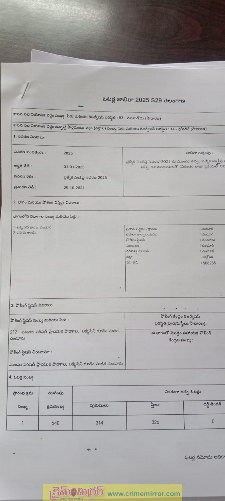 చండూరు, క్రైమ్ మిర్రర్:-మున్సిపాలిటీలకు సంబంధించి జనవరి 1న ముసాయిదా ఓటర్ జాబితాను ప్రకటించాల్సి ఉంది. వార్డుల వారిగా ఓటర్ల జాబితాను సిద్ధం చేయడంలో రాష్ట్రంలోనే అన్ని మున్సిపాలిటీల్లో అధికారులు నిమగ్నమయ్యారు. చండూరు మున్సిపాలిటీలో 10 వార్డులు ఉండగా ముసాయిదా ఓటర్ జాబితాను బుధవారం నాటికే సిద్ధం చేసిన చండూరు మున్సిపాలిటీ కమిషనర్ మల్లేశం అండ్ అధికారులు, బి ఎల్ వోలు రాష్ట్రంలోనే ముందంజలో ఉన్నట్లుగా సమాచారం. అసెంబ్లీ ఓటర్ జాబితాను పోలింగ్ బూతుల వారి నుంచి వార్డుల వారిగా విభజిస్తూ ముసాయిదా ఓటర్ జాబితాన్ని సిద్ధం చేశారు. జనవరి 1న ముసాయిదా ఓటర్ జాబితా విడుదల ఉంటుంది… 4వ తేదీ వరకు అభ్యంతరాలు తెలియజేయవచ్చు. 10న తుది జాబితా విడుదల ఉంటుంది.