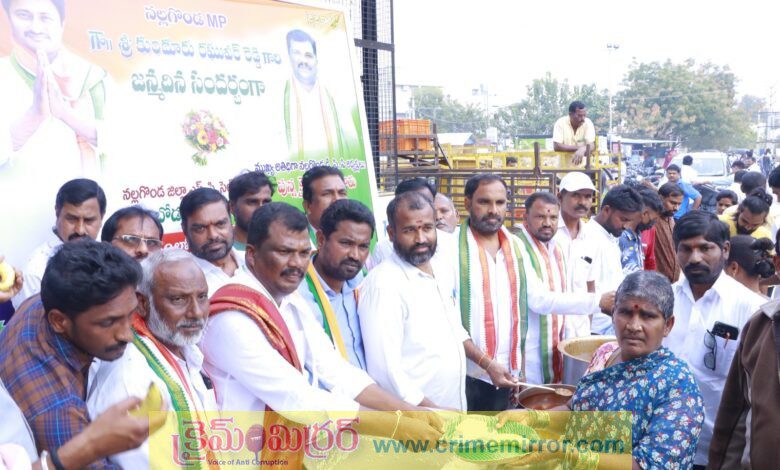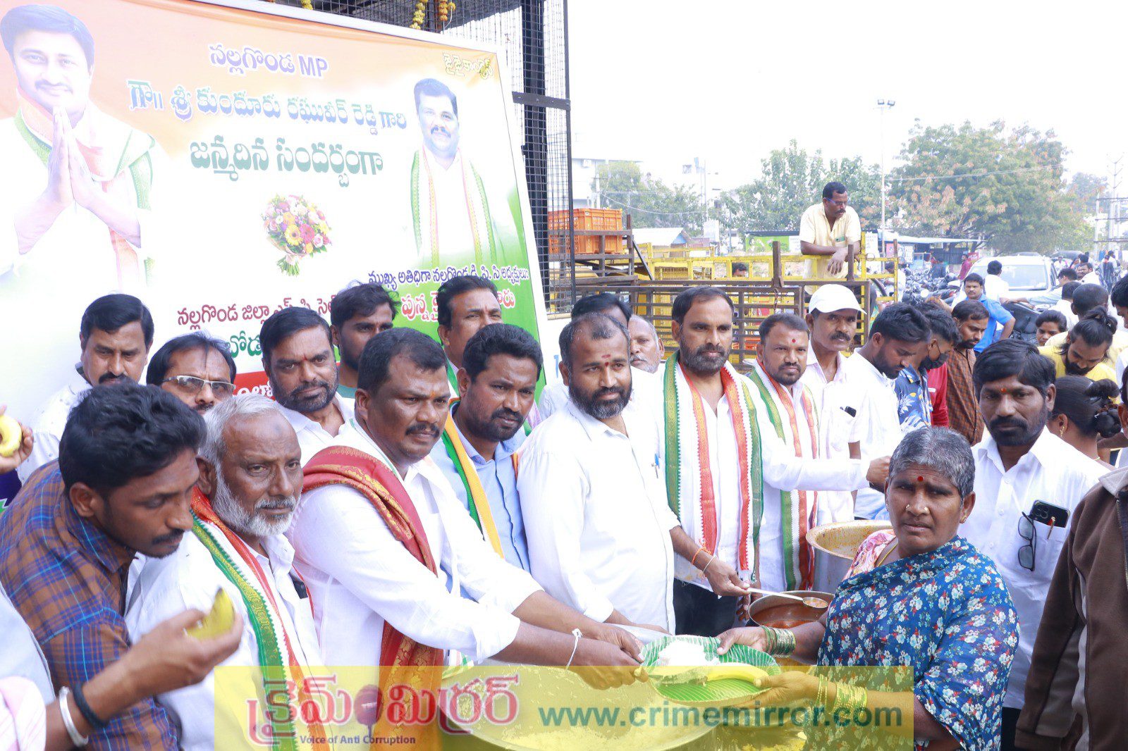 మునుగోడు,క్రైమ్ మిర్రర్ :- నలగొండ పార్లమెంట్ సభ్యులు కుందూరు రఘువీర్ రెడ్డి జన్మదిన వేడుకలు జిల్లా కేంద్రంలో ఘనంగా నిర్వహించడం జరిగింది. జిల్లా కాంగ్రెస్ ఎస్సీ సెల్ చైర్మన్ బోడ స్వామి ఆధ్వర్యంలో జరిగిన ఈ వేడుకల్లో జిల్లా డీసీసీ అధ్యక్షులు పున్న కైలాష్ నేత ముఖ్యఅతిథిగా హాజరైనారు. జిల్లా కేంద్రంలో మదర్ ధేరిస్సా నిర్మల్ హృదయ్ చారిటబుల్ ట్రస్ట్ నందు వృద్ధులకు కావలసిన నిత్యవసర వస్తువులు పండ్లు పంపిణీ చేయడం జరిగింది. అనంతరం చారిటబుల్ సభ్యులు మానసిక వికలాంగులు మధ్య కేక్ కటింగ్ నిర్వహించడం జరిగింది. జిల్లా కేంద్రంలోని ప్రభుత్వ ఆసుపత్రి నందు రోగులకు పండ్ల పంపిణీ అన్నదాన కార్యక్రమం నిర్వహించడం జరిగింది. ఈ సందర్భంగా డిసిసి అధ్యక్షులు పున్న కైలాష్ నేత మాట్లాడుతూ యువత రైతులకు మేధావులకు ఆదర్శంగా నిలిచిన ఎంపీ రఘువీర్ రెడ్డి భవిష్యత్తులో మరిన్ని పదవులు చేపట్టాలని కొనియాడారు. రాజకీయాల్లో ప్రజలతో మమేకమై రాష్ట్ర రాజకీయాలను శాసించిన జానారెడ్డి రాజకీయ వారసుడుగా నేడు ప్రశంసలు అందుకుంటున్న రఘువీర్ రెడ్డి దేశంలో అత్యధికమైన మెజార్టీతో గెలుపొందారని అలాంటి నాయకుడి అడుగుజాడల్లో కాంగ్రెస్ నడుస్తుందని అన్నారు. అదేవిధంగా పున్న కైలాష్ నేత ఆధ్వర్యంలో అయాన్ష్ భార్గవ్ ట్రస్ట్ వారు నార్కెట్పల్లి చెరువుగట్టు దేవస్థానం నందు భక్తులకు అన్నదాన ప్రసాదం కార్యక్రమాన్ని నిర్వహించడం జరిగింది. ఈ కార్యక్రమంలో జిల్లా సీనియర్ నాయకులు,వివిధ నియోజకవర్గాల నాయకులు,తదితరులు పాల్గొన్నారు.