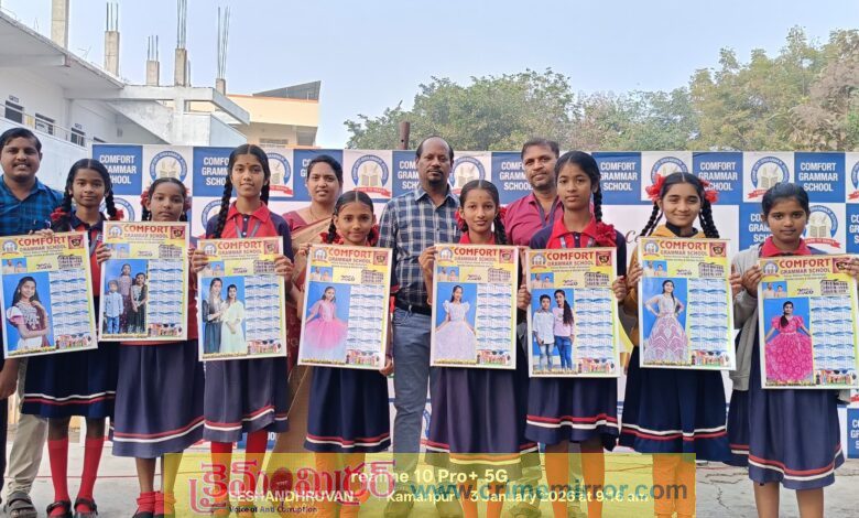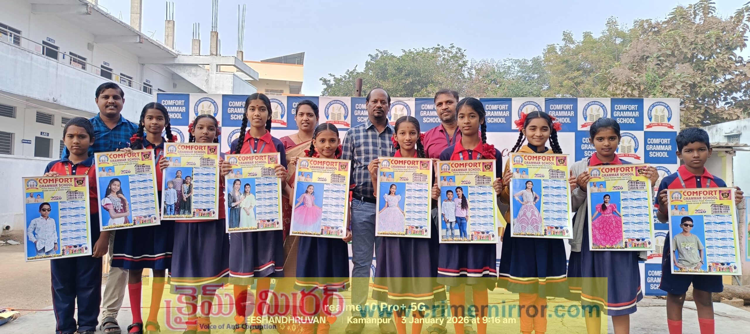 పెద్దపల్లి జిల్లా,క్రైమ్ మిర్రర్:- కమాన్ పూర్ మండల కేంద్రంలోని కంఫర్ట్ గ్రామర్ పాఠశాలలో న్యూఇయర్ క్యాలెండర్ ను పాఠశాల ప్రధానోపాధ్యాయులు అర్ణకొండ వినయకుమార్, సౌమ్య గార్లు ఆవిష్కరించారు. ఈ కార్యక్రమంలో పాఠశాల ప్రిన్సిపాల్ వినయకుమార్ మాట్లాడుతూ ఈ నూతన సంవత్సరంలో అందరు సుఖ సంతోషాలతో ఉండాలని, నూతన సంవత్సరంలో ఉత్తమ ఫలితాలు సాధించాలని ప్రతి పనిలో విజయం సాధించాలని సందేశాన్ని ఇచ్చారు. ఈ కార్యక్రమంలో ఉపాధ్యాయులు,పిల్లలు పాల్గొన్నారు.