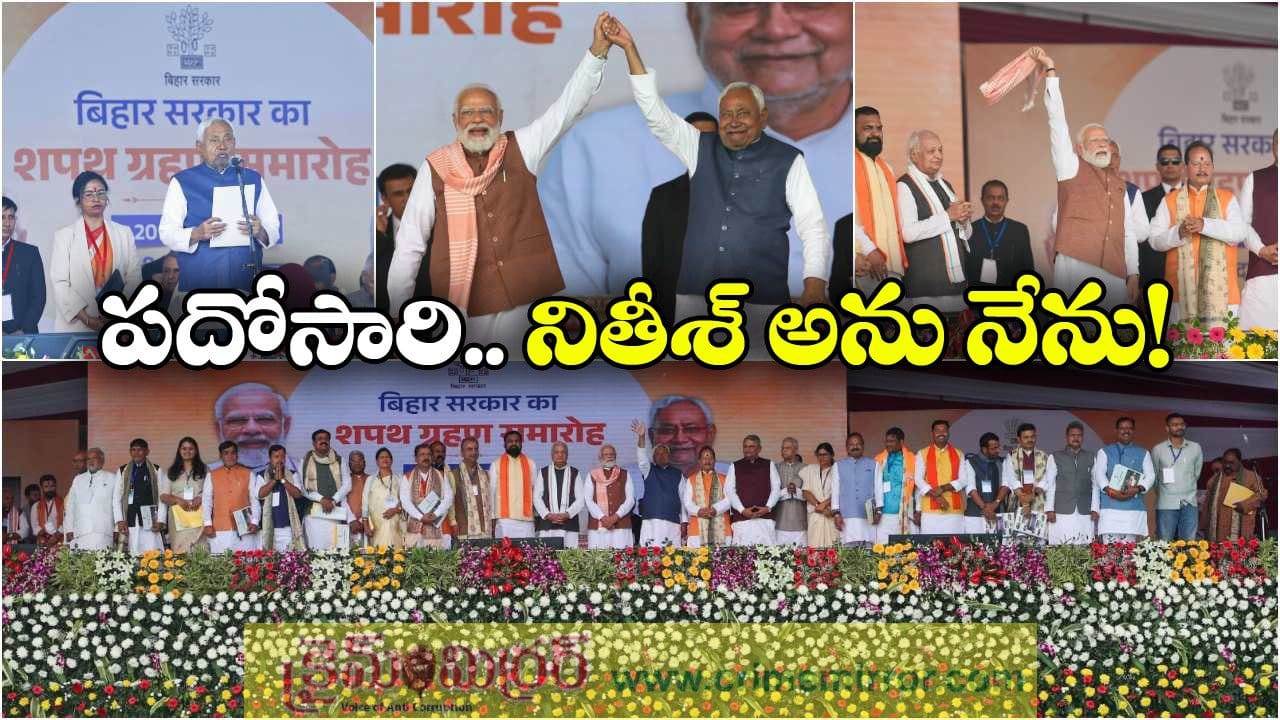 Nitish Kumar Takes Oath: బీహార్ ముఖ్యమంత్రిగా నితీశ్ కుమార్ పదోసారి ప్రమాణ స్వీకారం చేశారు. పట్నా గాంధీ మైదానంలో గవర్నర్ ఆరిఫ్ మొహమ్మద్ ఖాన్ నితీశ్ తో ప్రమాణం చేయించారు. బీజేపీకి చెందిన సమ్రాట్ చౌదరి, విజయ్ కుమార్ సిన్హా డిప్యూటీ సీఎంలుగా ప్రమాణ స్వీకారం చేశారు. బీజేపీకి చెందిన మొత్తం 14 మంది, జేడీయూకు చెందిన 8 మంది, ఎల్జేపీ నుంచి ఇద్దరు, హిందూస్థాన్ అవామ్ మోర్చా, ఆర్ఎల్ఎం నుంచి ఒక్కొక్కరు మంత్రులుగా ప్రమాణస్వీకారం చేశారు.
