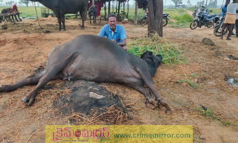 వలిగొండ, క్రైమ్ మిర్రర్ :- యాదాద్రి భువనగిరి జిల్లా,వలిగొండ మండల పరిధిలోని సంగెం గ్రామంలో నిన్న రాత్రి 8 గంటల సమయంలో భారీ వర్షంతో పిడుగు పాటు సంభవించింది. పిడుగుపాటుతో చిలుకల లింగస్వామి అనే రైతుకు చెందిన పాడి గేదేను చెట్టుకు కట్టి వేయడంతో పిడుగు చెట్టుపై పడడంతో గేదే మృతి చెందడం జరిగింది.పాడి గేదే మృతి చెందడంతో1,20,000 వరకు నష్టం జరిగిందని ప్రభుత్వం తనను ఆదుకోవాలని రైతు లింగస్వామి ప్రభుత్వాన్ని కోరుతున్నారు.