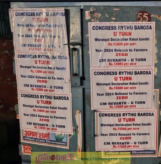 రాహుల్ గాంధీ తెలంగాణకు వచ్చి వరంగల్ డిక్లరేషన్ పేరు మీద తెలంగాణ రైతులకు ఎకరానికి 15000 రూపాయలు చొప్పున ఇస్తామని ప్రకటించి, కాంగ్రెస్ అధికారంలో వచ్చిన తర్వాత 2024 సంవత్సరంలో రైతులకు ఒక్క రూపాయి కూడా విడుదల చేయకపోవడం, ఇటీవల సీఎం రేవంత్ యూటర్న్ తీసుకుంటూ ఎకరాకు 15000 ఇవ్వమని ప్రకటించడంపై ఏకంగా ఏఐసీసీ కాంగ్రెస్ కార్యాలయం వద్ద “కాంగ్రెస్ రైతు భరోసా యూటర్న్” పేరుతో పోస్టర్లు అంటించారు.