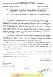 రాష్ట్రవ్యాప్తంగా ఈ నిబంధనలు ఖచ్చితంగా అమలయ్యేలా జిల్లా పౌర సంబంధాల అధికారులకు స్పష్టమైన ఆదేశాలు జారీ అయ్యాయి. ప్రతి జిల్లా పరిధిలో అక్రిడిటేషన్ కార్డు లేని వ్యక్తులు తమ వాహనాలపై ఉన్న Press లోగోలను వెంటనే తొలగించేలా చర్యలు తీసుకోవాలని డీపీఆర్ఓలను ఆదేశించారు. ప్రభుత్వ గుర్తింపు లేని జర్నలిస్టులు వాహనాలపై Press అనే పదాన్ని కొనసాగిస్తే చర్యలు తప్పవని హెచ్చరించారు.