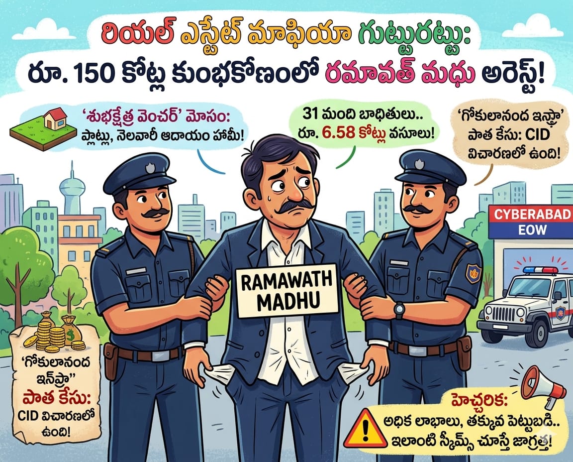 హైదరాబాద్(క్రైమ్ మిర్రర్): హైదరాబాద్ కేంద్రంగా సాగుతున్న రియల్ ఎస్టేట్ మాఫియా గుట్టును, సైబరాబాద్ ఆర్థిక నేరాల విభాగం పోలీసులు రట్టు చేశారు. అధిక లాభాలు, నెలవారీ ఆదాయం అంటూ ఆశ చూపి, అమాయక ప్రజల నుండి కోట్లాది రూపాయలు కొల్లగొట్టిన ‘శుభక్షేత్ర వెంచర్’ నిర్వాహకుడు, రమావత్ మధును పోలీసులు గురువారం అరెస్ట్ చేశారు. మియాపూర్లో కార్యాలయం ఏర్పాటు చేసిన నిందితుడు, ఐదు లక్షలు పెట్టుబడి పెడితే, సంగారెడ్డి జిల్లా దామరగిద్దలో 102 గజాల ప్లాట్ ఇవ్వడమే కాకుండా, 42 నెలల పాటు నెలకు 25 వేల చొప్పున ఆదాయం చెల్లిస్తామని నమ్మబలికాడు.
