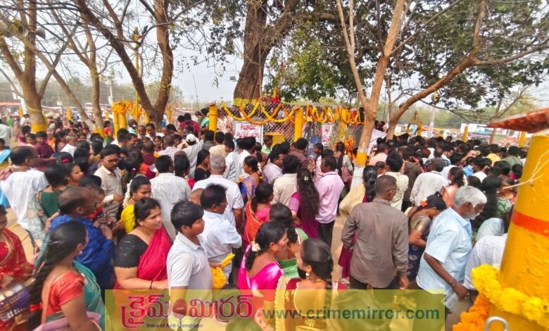 రామకృష్ణాపూర్,క్రైమ్ మిర్రర్:-మందమర్రి ఏరియా ఆర్కే–1ఏ అటవీ ప్రాంతం ఆధ్యాత్మిక వాతావరణంతో పులకించిపోయింది. సింగరేణి యాజమాన్యం ఆధ్వర్యంలో వైభవంగా నిర్వహిస్తున్న సమ్మక్క–సారలమ్మ జాతర బుధ, గురువారాల్లో కీలక ఘట్టాలకు చేరుకుంది. సింగరేణి కార్మికులు, పరిసర గ్రామాల ప్రజల జయజయధ్వానాల మధ్య వనదేవతలు గద్దెలపైకి కొలువుదీరారు. జాతరలో భాగంగా బుధవారం సాయంత్రం సారలమ్మను, గురువారం సమ్మక్క తల్లిని అత్యంత వైభవంగా గద్దెలపైకి తీసుకువచ్చారు. డప్పు వాయిద్యాలు, శివసత్తుల పూనకాలు, భక్తుల కొబ్బరికాయల నైవేద్యాలతో ఆ ప్రాంతం మార్మోగిపోయింది. ఇద్దరు వనదేవతలు గద్దెలపైకి చేరడంతో జాతరలో అసలైన ఉత్సాహం నెలకొంది.పోటెత్తిన భక్తజనం మందమర్రి, రామకృష్ణాపూర్ పరిసర ప్రాంతాల నుంచి భక్తులు భారీగా తరలివచ్చారు. అమ్మవార్ల దర్శనానికి తెల్లవారుజాము నుంచే కిలోమీటర్ల మేర క్యూలైన్లలో భక్తులు వేచి చూశారు. అమ్మవార్లకు ఎత్తు బంగారం సమర్పించి పసుపు కుంకుమలతో ప్రత్యేక పూజలు నిర్వహించారు.భక్తుల రద్దీని దృష్టిలో ఉంచుకుని బెల్లంపల్లి ఏసిపి ఆద్వర్యంలో పోలీసులు భారీ బందోబస్తు ఏర్పాటు చేశారు. సింగరేణి సెక్యూరిటీ సిబ్బంది, పోలీసులు సమన్వయంతో క్యూలైన్లను క్రమబద్ధీకరించారు. అటవీ ప్రాంతంలో నిర్వహిస్తున్న ఈ జాతర స్థానికులకు మేడారం జాతరను తలపించేలా సాగుతోంది.
