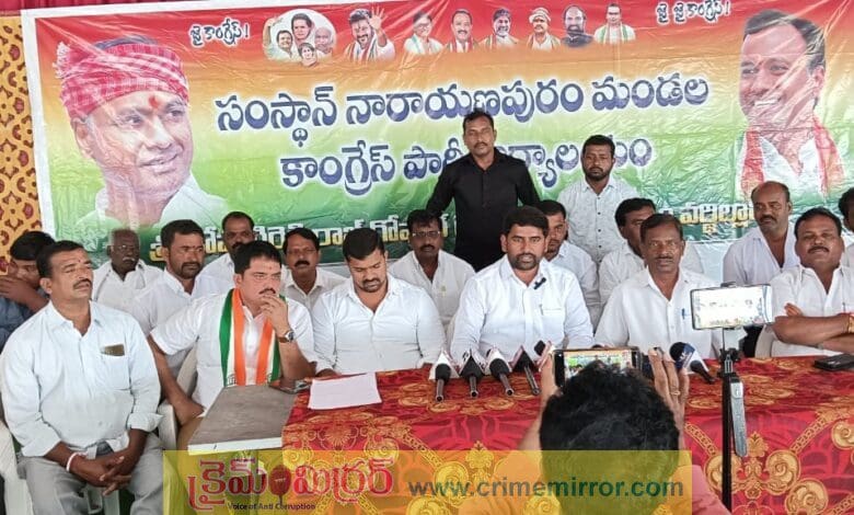 సంస్థాన్ నారాయణపూర్,క్రైమ్ మిర్రర్:- మునుగోడు ఎమ్మెల్యే కోమటిరెడ్డి రాజగోపాల్ రెడ్డి పదవుల కోసం పాకులాడే వ్యక్తి కాదని అతనిపై అనుచిత వ్యాఖ్యలు మానుకోవాలని చలమల్ల కృష్ణారెడ్డిని మండల కాంగ్రెస్ నాయకులు శ్రీనివాస్ నాయక్ హెచ్చరించారు. సోమవారం నారాయణపురం మండల కేంద్రంలో మండల కమిటీ ఆద్వర్యంలో విలేకరుల సమావేశం నిర్వహించారు.ఈ సందర్భంగా వారు మాట్లాడుతూ నాలుగు రోజుల క్రితం చలమల్ల కృష్ణారెడ్డి ఎమ్మెల్యే రాజగోపాల్ రెడ్డి పై అనుచిత వ్యాఖ్యలను చేశారని వెంటనే వ్యాఖ్యలను వెనక్కి తీసుకొని.. క్షమాపణ చెప్పాలని లేనియెడల నియోజకవర్గంలో తిరగలేరని హెచ్చరించారు. రాజగోపాల్ రెడ్డి గురించి మాట్లాడే ముందు అతని వ్యక్తిత్వం తెలుసుకోవాలని హితవు పలికారు. సొంత నిధులతో నియోజకవర్గాన్ని ఎన్నో రకాలుగా అభివృద్ధి చేస్తూ నిరంతరం నియోజకవర్గ అభివృద్ధిపై సమీక్ష నిర్వహిస్తూ ఒక మోడల్ నియోజకవర్గంగా తీర్చిదిద్దుతున్నారని అన్నారు.