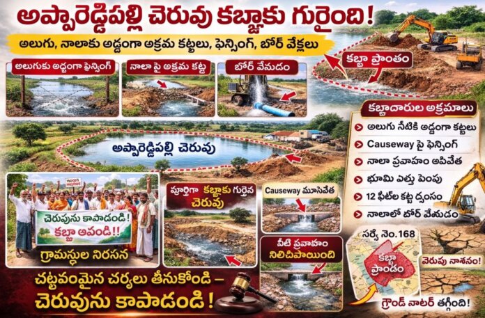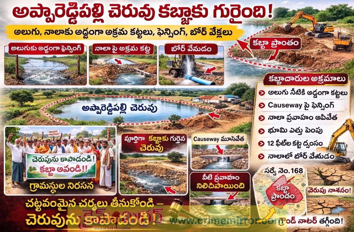 రంగారెడ్డి,క్రైమ్ మిర్రర్:- మాడ్గుల మండలం అప్పారెడ్డిపల్లి గ్రామంలో ఉన్న కొత్త చెరువు కబ్జాల వ్యవహారం రోజురోజుకూ ఉద్రిక్తంగా మారుతోంది. చెరువు ఆక్రమణలను తొలగించాలని గ్రామస్థులు గత నెల రోజులుగా ఆందోళన చేస్తున్నప్పటికీ సంబంధిత అధికారులు మాత్రం నిర్లక్ష్యంగా వ్యవహరిస్తున్నారని గ్రామస్థులు ఆగ్రహం వ్యక్తం చేస్తున్నారు.