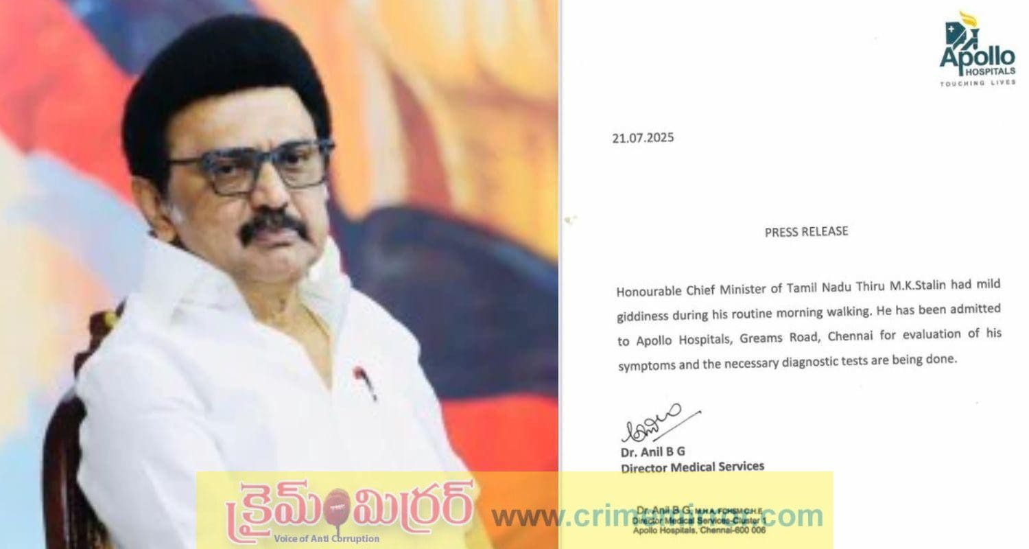 క్రైమ్ మిర్రర్, తమిళనాడు న్యూస్:- తమిళనాడు రాష్ట్ర ముఖ్యమంత్రి స్టాలిన్ ఈరోజు ఉదయం తీవ్ర అస్వస్థతకు గురయ్యారు. మార్నింగ్ వాక్ చేస్తుండగా ఒక్కసారిగా కళ్ళు తిరగడం లాంటి లక్షణాలు కనిపించడంతో వెంటనే.. చెన్నైలోని ప్రముఖ అపోలో ఆసుపత్రిలో చేరారు. హాస్పటల్ వైద్య బృందం ముఖ్యమంత్రి స్టాలిన్ ఆరోగ్య పరిస్థితిని ఎప్పటికప్పుడు పరిశీలిస్తూ… అన్ని చెకప్ లు కూడా చేశారు. అయితే తాజాగా సీఎం స్టాలిన్ హెల్త్ బులిటెన్ అపోలో ఆసుపత్రి డాక్టర్లు విడుదల చేశారు.