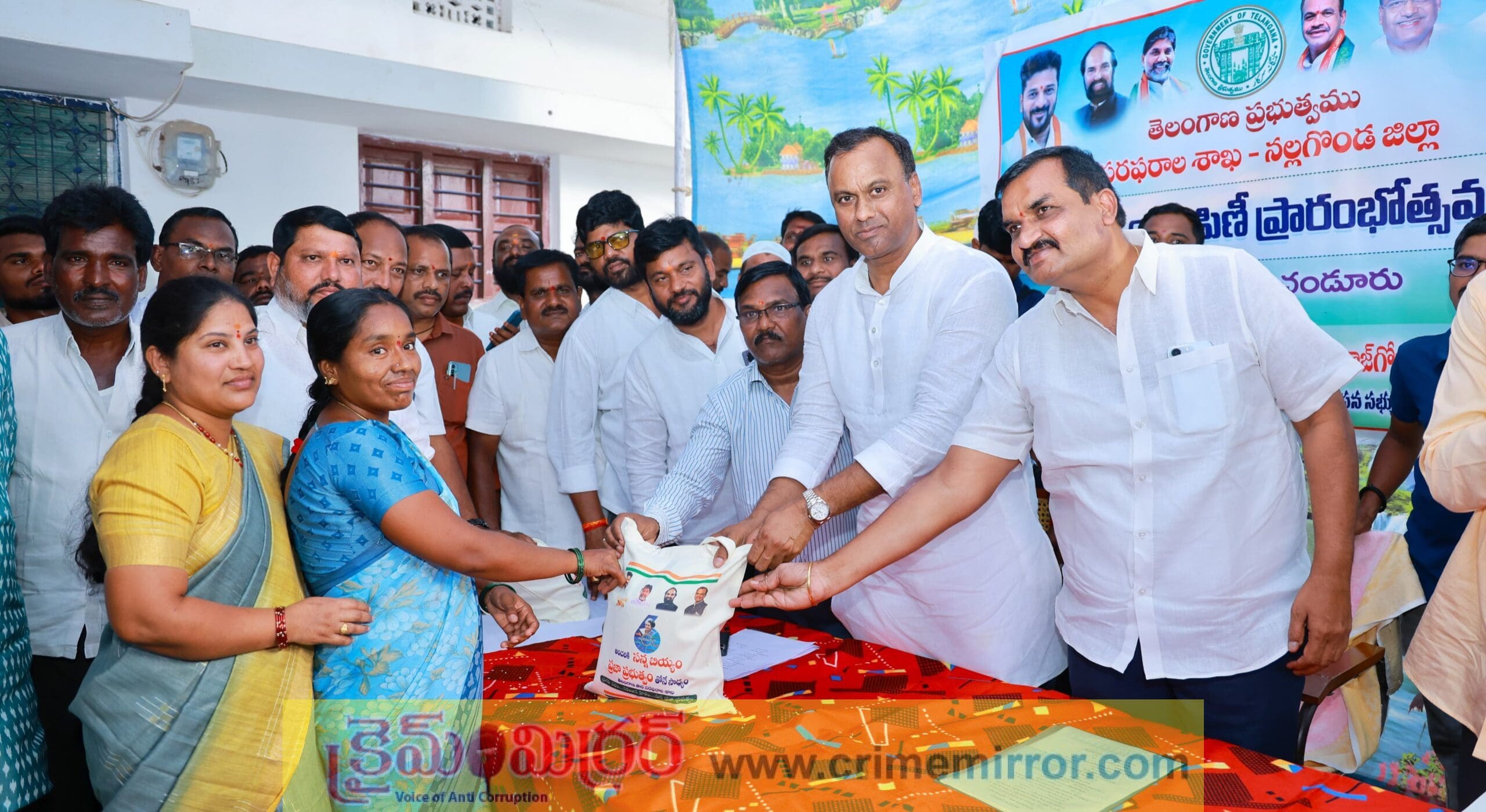 చండూరు, క్రైమ్ మిర్రర్:- సన్న బియ్యం పంపిణీ దేశ చరిత్రలోనే నిలిచిపోయే గొప్ప విషయమని మునుగోడు ఎమ్మెల్యే కోమటిరెడ్డి రాజగోపాల్ రెడ్డి అన్నారు. చండూరులో ఆయన శుక్రవారం సన్న బియ్యం పంపిణీ కార్యక్రమాన్ని ప్రారంభించారు. 16 నెలల కాంగ్రెస్ పార్టీ ప్రభుత్వంలో రైతులకు రుణమాఫీ చేసింది అన్నారు. మహిళలకు ఆర్టీసీ బస్సులో ఉచిత ప్రయాణం , 200 యూనిట్ల వరకు ఉచిత కరెంటు ఇస్తున్నామన్నారు, సిలిండర్ పై 500 రూపాయల సబ్సిడీ ఇస్తున్నట్లు తెలిపారు. పేద ప్రజలకు సన్న బియ్యం పంపిణీ చేయాలని ఆలోచన చేసిన ముఖ్యమంత్రి రేవంత్ రెడ్డికి, సివిల్ సప్లై మంత్రి ఉత్తంకుమార్ రెడ్డికి తెలంగాణ ప్రజల తరఫున మునుగోడు నియోజకవర్గ ప్రజల తరఫున ప్రత్యేక ధన్యవాదాలు తెలిపారు. గత ప్రభుత్వంలో ఉప ఎన్నిక వస్తేనే రేషన్ కార్డులు ఇచ్చారన్నారు.