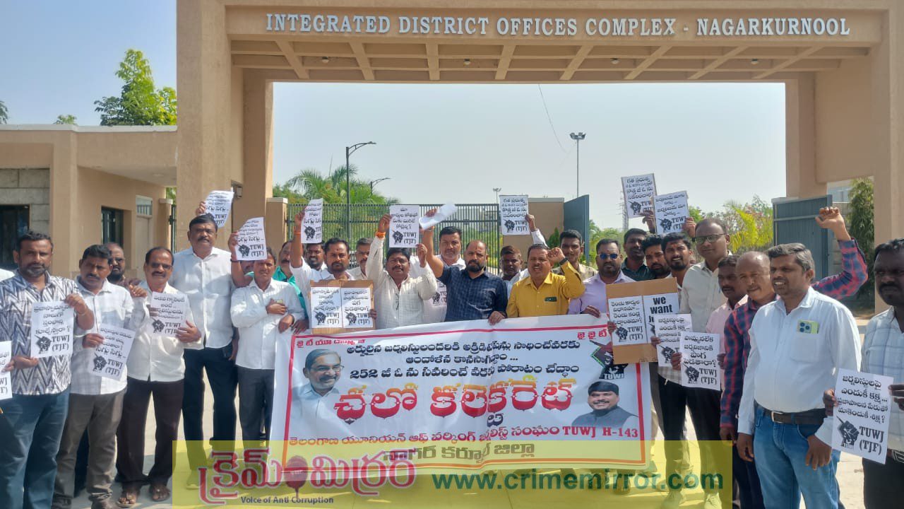 నాగర్ కర్నూల్ జిల్లా బ్యూరో, క్రైమ్ మిర్రర్:- తెలంగాణలో జర్నలిస్టుల హక్కులను హరించే విధంగా జారీ చేసిన జీవో నెంబర్ 252 సవరించాలని తెలంగాణ యూనియన్ ఆఫ్ వర్కింగ్ జర్నలిస్ట్ (TUWJ – హెచ్ 143) మరియు తెలంగాణ జర్నలిస్టు ఫోరం (TJF), తెలంగాణ ఎలక్ట్రానిక్ మీడియా జర్నలిస్ట్ యూనియన్ (TEMJU) జర్నలిస్ట్ సంఘాలు శనివారం నాగర్ కర్నూల్ జిల్లా కలెక్టర్ కార్యాలయం ముందు భారీ నిరసన, ధర్నా నిర్వహించారు. తెలంగాణ రాష్ట్ర ప్రభుత్వం కొత్త జర్నలిస్టు పాలసీని ప్రకటిస్తూ జారీ చేసిన జీవో 252 జర్నలిస్టు సమాజానికి తీరని నష్టం కలిగిస్తుందని ఆ సంఘాల నాయకులు అన్నారు. తెలంగాణ యూనియన్ ఆఫ్ వర్కింగ్ జర్నలిస్ట్ హెచ్ 143 జిల్లా అధ్యక్షుడు ఎం చంద్రశేఖర రావు, రాజేష్ గౌడ్, శేఖరా చారి,తెలంగాణ ఎలక్ట్రానిక్ మీడియా జర్నలిస్టు సంఘం జిల్లా అధ్యక్షుడు ఖానాపురం ప్రదీప్, సత్యం తదితరులు మాట్లాడుతూ జర్నలిస్టుల అక్రిడేషన్ పాలసీ పేరుతో రాష్ట్ర ప్రభుత్వం తెచ్చిన జీవో డెస్క్ జర్నలిస్టులకు అక్రిడేషన్లు రద్దు చేయడం, పెద్ద సంఖ్యలో జర్నలిస్టులక్రిడేషన్లను కుదించడం ద్వారా జర్నలిస్టుల హక్కులను హరించడమే అవుతుందన్నారు.