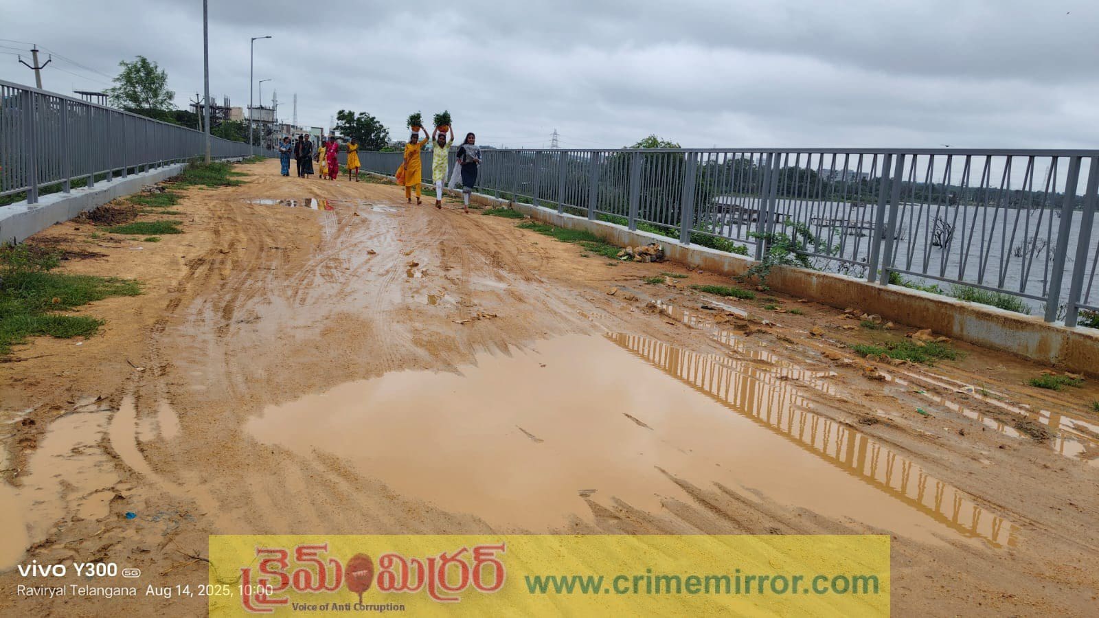 మహేశ్వరం,క్రైమ్ మిర్రర్:- మహేశ్వరం నియోజకవర్గం, తుక్కుగూడ మున్సిపాలిటీ పరిధిలోని రావిర్యాల పెద్ద చెరువు కట్టకు భారీ ఎత్తున గండి పడుతుంది.గత రెండు రోజులుగా కురుస్తున్న వర్షానికి చెరువు కట్ట పైన ఉన్న నీరు చెరువులోకి వెళ్ళకపోవడంతో చెరువు కట్ట కిందికి వరదలా రావడంతో.. కట్టకు గండి పడటం మొదలైంది. తక్షణమే ఇరిగేషన్ అధికారులు తగినచర్యలు తీసుకొని కట్టకు వెంటనే మరమత్తులు చేపట్టాలని రావిర్యాల గ్రామ ప్రజలు కోరుతున్నారు.అదేవిధంగా ఈ రోజు కట్ట మైసమ్మ , పోచమ్మ బోనాలు కావడంతో కట్ట మార్గాన దర్శనానికి భక్తులు తరలి వస్తున్నారు.చెరువు కట్టపైన కట్టపైన భారీగా నీళ్లు నిలవడంతో రోడ్డు బురదల మారి కట్టమైసమ్మ గుడికి వెళ్లే భక్తులు తీవ్ర ఇబ్బందులు ఎదుర్కున్నారు.వెంటనే సంబంధిత అధికారులు తగిన చర్యలు తీసుకొని ప్రజలకు రోడ్డు సౌకర్యం కల్పించాలని కోరుతున్నారు. లేకపోతే రాబోయే రోజుల్లో చెరువు కట్ట పూర్తిగా దెబ్బ తినేటటువంటి అవకాశం ఉంది.