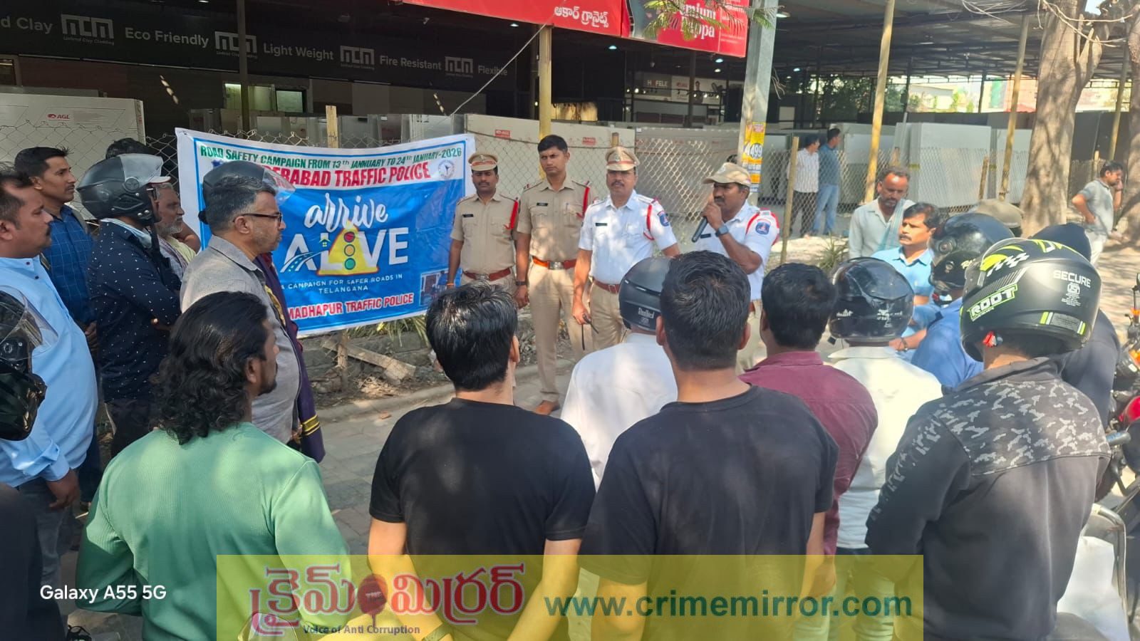 మాదాపూర్,క్రైమ్ మిర్రర్:- తెలంగాణ ప్రభుత్వం ప్రతిష్టాత్మకంగా చేపట్టిన “అరైవ్ అలైవ్” కార్యక్రమంలో భాగంగా, సైబరాబాద్ పోలీస్ కమిషనరేట్ సీపీ ఆదేశాల మేరకు మాదాపూర్ పోలీస్ స్టేషన్ పరిధిలో ట్రాఫిక్ పోలీస్ అధికారులతో కలిసి శనివారం రోజు 100 ఫీట్ రోడ్లోని పంచకట్టు హోటల్ సమీపంలో ఉన్న బ్లాక్ స్పాట్ వద్ద రోడ్డు భద్రతపై అవగాహన కార్యక్రమం నిర్వహించారు. ఈ కార్యక్రమంలో సుమారు 50 మంది వాహన వినియోగదారులు పాల్గొనగా, ఈ సందర్భంగా పోలీసులు మాట్లాడుతూ…“సురక్షితంగా ప్రయాణించి గమ్యానికి చేరుకోవడం” అనే ముఖ్య ఉద్దేశంతో హెల్మెట్ తప్పనిసరిగా ధరించడం, మద్యం సేవించి వాహనం నడపకూడదని, రాంగ్ రూట్లో వాహనం నడపకుండా ఉండడం, మైనర్లకు వాహనాలు అప్పగించకుండా ఉండడం, నిర్లక్ష్యంగా వాహనం నడపకుండా ఉండడం, మలుపులు మరియు లైటింగ్ లేని ప్రదేశాల్లో నెమ్మదిగా వాహనం నడపడం, ట్రాఫిక్ నిబంధనలను కచ్చితంగా పాటించడం, నో ఎంట్రీ సమయంలో ఓవర్ లోడెడ్ వాహనాలతో సిటీ లోకి రాకుండా ఉండడం వంటి అంశాలపై విస్తృతంగా అవగాహన కల్పించారు. ఈ అవగాహన కార్యక్రమంలో మాదాపూర్ డిఐ విజయ్ కుమార్ , ట్రాఫిక్ సీఐ శ్రీధర్తో పాటు ఎస్.ఐ.లు వీ.రమణ, బాలరామ్ ఇతర పోలీస్ సిబ్బంది పాల్గొన్నారు.