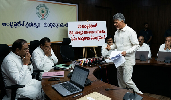 ప్రస్తుతం కూటమి ప్రభుత్వానికి అంతా సానుకూలంగా ఉంది. జగన్మోహన్ రెడ్డి సెల్ఫ్ గోల్ వేసుకున్నట్లు కనిపిస్తోంది. ఇటువంటి పరిస్థితుల్లో అమరావతి వేదికగా చంద్రబాబు మంత్రివర్గ సమావేశాన్ని ఏర్పాటు చేస్తున్నట్లు ప్రకటించారు. మంత్రులకు సమాచారం అందించారు. రాష్ట్రంలో మారిన రాజకీయ పరిస్థితుల నేపథ్యంలో క్యాబినెట్ సమావేశంలో చర్చించాల్సిన అంశాలపై సీరియస్ గానే కసరత్తు చేశారు. వాటిపై ప్రాథమికంగా మంత్రులకు సమాచారం ఇచ్చారు. ఇంతలోనే క్యాబినెట్ సమావేశాల విషయంలో చర్చించాల్సిన అంశాలు మీడియాలో కథనాలుగా వచ్చాయి. దీంతో ఒక్కసారిగా సీఎం చంద్రబాబు ఆశ్చర్యపోయారు. అసలు క్యాబినెట్ సమావేశంలో చర్చించాల్సిన అంశాలు మీడియాలో ఎలా వచ్చాయి అనే విషయంపై ఆరా తీశారు. అయితే కొంతమంది మంత్రులే లీకులు ఇచ్చినట్లు తేలడంతో ఒక్కసారిగా ఆందోళనకు గురయ్యారు.