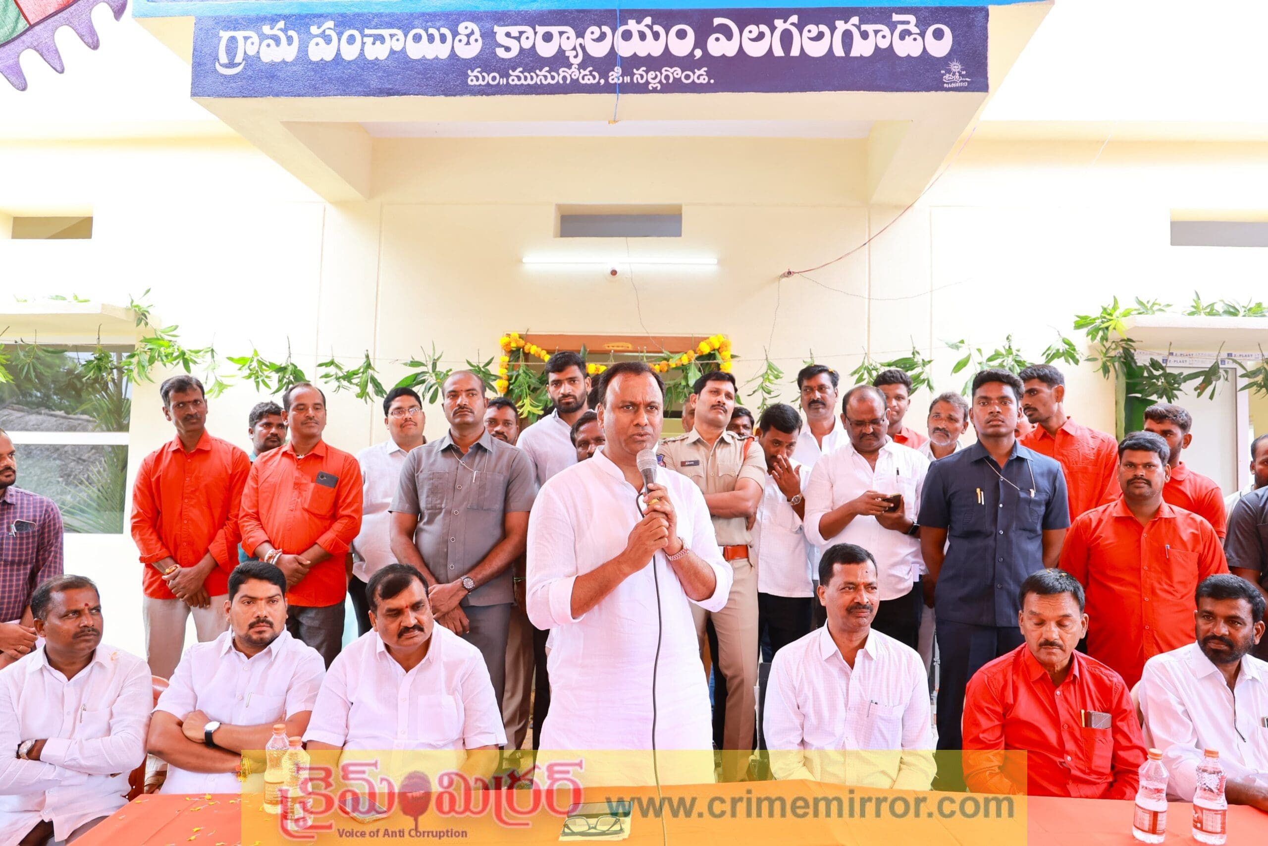 మునుగోడు,క్రైమ్ మిర్రర్:- నాకు అన్యాయం జరిగిన పర్వాలేదు కానీ నా మునుగోడు ప్రజలకు అన్యాయం జరగొద్దు అని ఎంఎల్ఏ కోమటిరెడ్డి రాజగోపాల్ రెడ్డి అన్నారు. మునుగోడు మండలంలోని ఏలగలగూడెం గ్రామంలో 20 లక్షల రూపాయల వ్యయంతో నూతనంగా నిర్మించిన గ్రామపంచాయతీ భవనాన్ని ఎమ్మెల్సీ నెల్లికంటి సత్యంతో కలిసి ఎమ్మెల్యే కోమటిరెడ్డి రాజగోపాల్ రెడ్డి ప్రారంభించారు. ఈ సందర్భంగా గ్రామ ప్రజలు ఘనంగా స్వాగతం పలికారు. గ్రామ పంచాయతీ భవన నిర్మాణమునకు భూమి ఇచ్చిన దంపతులను సన్మానించారు. గ్రామ సమస్యలను ఎమ్మెల్యే, ఎమ్మెల్సీ ల దృష్టికి తీసుకెళ్లారు. ముఖ్యంగా రోడ్డు సమస్యను పరిష్కరించాలని కోరారు. ఈ సందర్భంగా ఎమ్మెల్యే, ఎమ్మెల్సీ లను శాలువాలతో ఘనంగా సన్మానించారు. ఎమ్మెల్సీ నెల్లికంటీ సత్యం మాట్లాడుతూ అనాడు సరియైన నిధులు లేక రోడ్ల సమస్యలు ఉండడం జరిగిందని, రోడ్ల సమస్యతో అనేక ఇబ్బందులు పడడం జరిగింది. రోడ్డు వేస్తేనే అభివృద్ధి అనేది అవుతుంది అన్నారు. నిత్యం నియోజకవర్గ అభివృద్ధికి ఎమ్మెల్యే కోమటిరెడ్డి రాజగోపాల్ రెడ్డి కృషి చేయడం అభినందనీయం అన్నారు. ఎమ్మెల్యేతో కలిసి ప్రయాణం చేస్తామన్నారు.