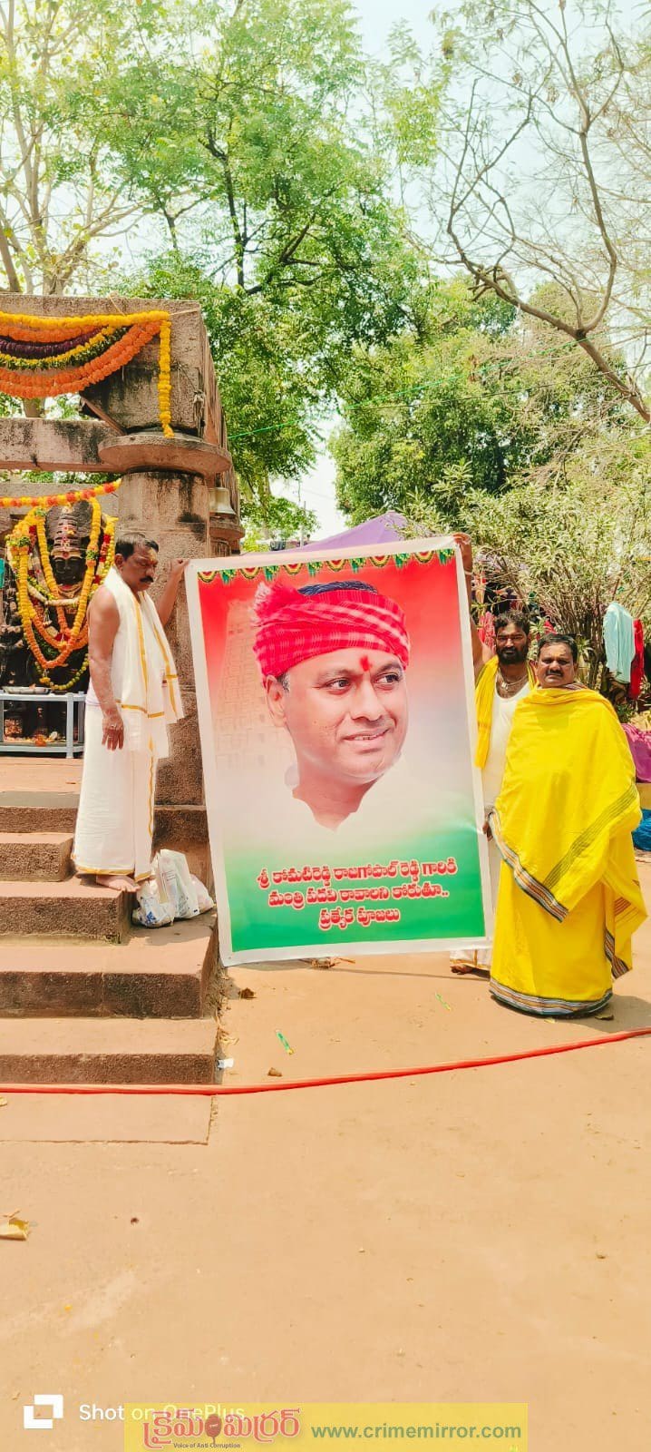 చండూరు, క్రైమ్ మిర్రర్: శ్రీశైలం భ్రమరాంబికా మల్లికార్జున స్వామి దేవస్థానం లో శనివారం మునుగోడు శాసనసభ్యులు కోమటిరెడ్డి రాజగోపాల్ రెడ్డికి మంత్రి పదవి రావాలని ప్రత్యేక పూజలు చేసిన చండూర్ మున్సిపాలిటీ అంగడిపేట మాజీ సర్పంచ్ నల్లగంటి మల్లేశం, కాంగ్రెస్ నాయకులు గండూరి జనార్ధన్, కురుమ సంఘం అధ్యక్షుడు కాంగ్రెస్ నాయకుడు అందిర్కరాజశేఖరులు. ఈ సందర్భంగా ఆయన చిత్రపటాన్ని ప్రదర్శించి ప్రత్యేక మొక్కులు మొక్కారు. మానవతావాదిగా ఎమ్మెల్యే కోమటిరెడ్డి రాజగోపాల్ రెడ్డి చేస్తున్న సేవా కార్యక్రమాలను వారు కొనియాడారు. మంత్రి పదవి రాగానే మళ్లీ వచ్చి మొక్కలు చెల్లించుకుంటామని తెలిపారు.